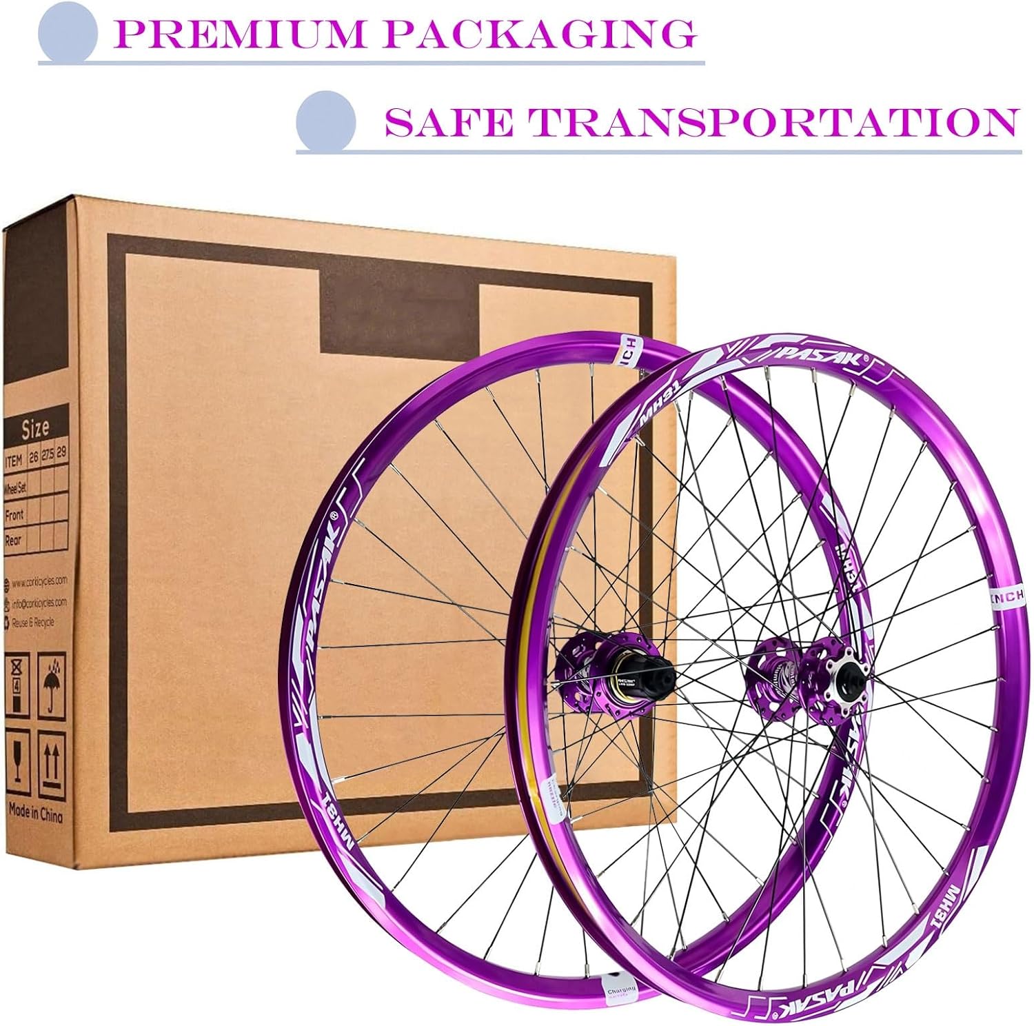 WHEELSET DESCRIPTION:Product: Mountain Bike wheel set (disc brake)SOURCE Category: SpotSize: 26/ 27.5/ 29 inchMaterial: aluminum alloyNumber of holes: 32HRim: Aluminum alloy double wall rimBearing: Front 2 Bearing / Rear 4 - BearingFront Hub: 9x100mm, Rear Hub: 10x135mmHub: Hole disc brake seat, the center distance of the hole screw is 44mm.Air nozzle: international standard beauty mouthCompatible: 7-8-9-10-11-12speed cassetteApplication: mountain bike, Road, City Fit: 1.25 ~2.25" tiresweight: 2150gColor: PurplePackage includes:wheel set * (1 pair)Quick release lever * (1 pair)Tire pad * (1 pair)100% SATISFACTION GUARANTEE: is committed to providing enthusiasts with cost-effective parts, And has provided assistance to more than 1,000,000+ users worldwide. If you have any questions, Please feel free to contact us, We will solve it in 24 hours.