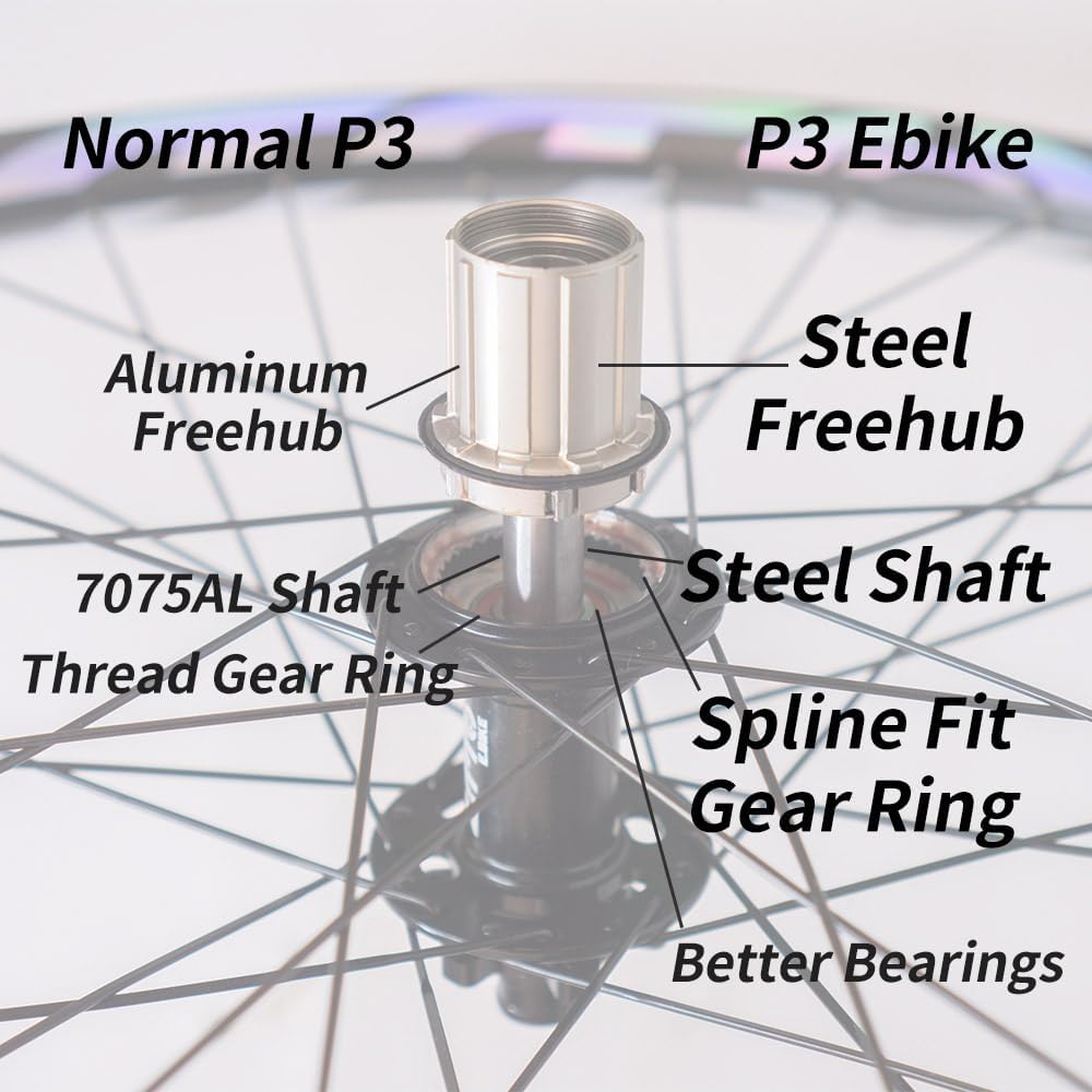 【Premium Specifications】This wheelset features specialized steel axles and a steel freehub, providing enhanced strength and durability compared to standard hubs, is available in 29" and 27.5" sizes. The rims boast an external width of 35mm and an internal width of 30mm, offering the perfect balance of strength and performance. Additionally, the wheelset features 6-bolt brake compatibility and 6pawls, 72 click/round steel hub, ensuring reliable performance on every ride. 【Indestructible Wheelset】Combined with 1.4-2.3 Aero spokes and P3EPROBOOST hub, our bike wheels are engineered with a durable structure and aluminum alloy rims for both front and rear brakes, ensuring exceptional durability and wear resistance for reliable, long-lasting performance, designed specifically for electric mountain bikes (e-bikes) and demanding downhill riding. (Front 15x110 Thru axle/ Rear 12x148 Thru axle and 10x141 QR) 【Steel-Powered Strength for E-Bikes】Aluminum may fall short when facing the raw torque of powerful E-motors — but not this wheelset. Crafted from reinforced steel, it's built to endure the high stress of electric drivetrains. Stronger than even 7075 aluminum, the steel freehub resists cassette bite marks, delivering unmatched durability and long-lasting performance. 【Precision Engagement】The six-pawl system is split into two groups of three, each trio slightly offset in timing. This smart design enables ultra-fast 5° engagement, delivering instant power transfer right after coasting. Each pawl is supported by its own independent spring leaf, ensuring strong, consistent engagement and outstanding durability. This means your hub maintains exceptional smoothness and reliability over time—no matter the terrain or weather conditions. 【Mixed 29/27.5" setup】Featuring a 29.7mm internal width and 21mm depth with a reinforced bar design, this tubeless-ready rim offers superior support for wide tires. Available in 27.5", 29", and a mixed 29/27.5" setup, it’s designed to meet the evolving demands of aggressive trail riders. The 32-hole J-bend spoke layout ensures long-term durability and easy maintenance at home.(ALL MTB Cassette Compatible) 【Reflective Rainbow Stickers】These vibrant stickers shimmer like a rainbow under sunlight, adding a unique and eye-catching look to your bike. At night, they reflect car headlights to enhance visibility and keep you safer on the road — a perfect blend of style and safety.
