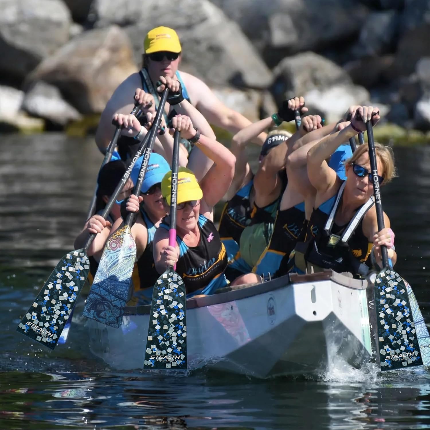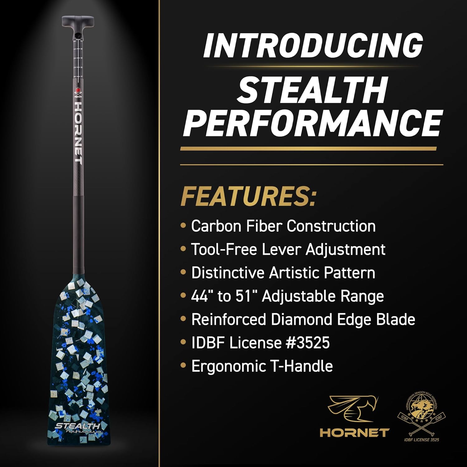 We’re excited to introduce the STEALTH Performance Series, our latest evolution in dragon boat paddle design. The STEALTH series features a distinctive marbleized carbon appearance, delivering a raw, modern look that stands apart from traditional woven carbon designs. Built for competition, each STEALTH paddle is IDBF approved and engineered for high-level racing. The construction delivers excellent stiffness, responsiveness, and durability for powerful, efficient strokes. Like our Sting+ lineup, STEALTH paddles feature a PMI foam core, our proprietary reinforced Diamond Edge to help prevent chips and cracks, and a durable matte finish designed for long-term performance. Available in multiple bold accent colors, the STEALTH Performance Series combines elite performance with a striking, modern carbon aesthetic — no two paddles look exactly alike.