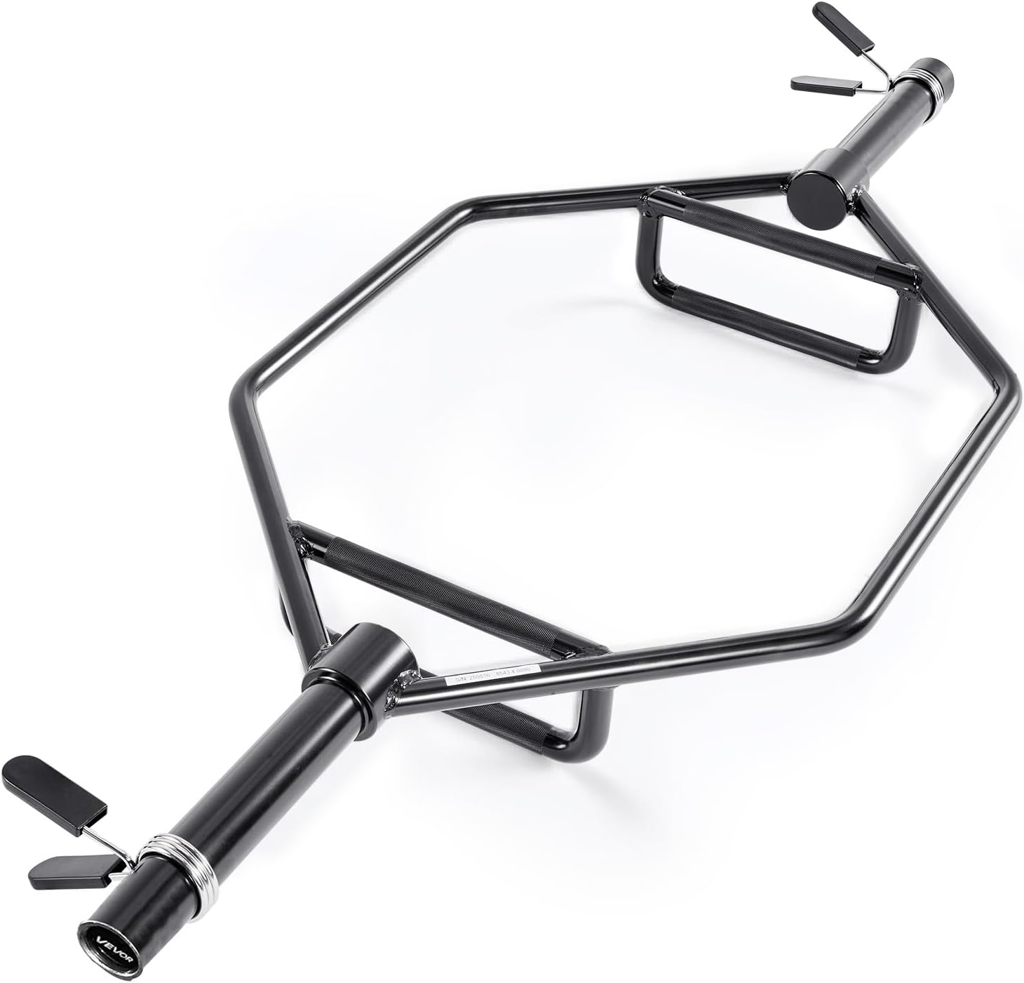 Professional One-Piece Trap Bar Hex BarThe barbell is a specialized training equipment used by weightlifters for exercises such as deadlifts, overhead presses, push-ups, floor presses, and shrugs. The extra-long loadable sleeves can hold more weight, allowing you to train through a greater range of muscle contraction and development. Key FeaturesHeavy-Duty Steel StructureBuilt with robust and durable heavy-duty steel, this structure ensures a long-lasting, reliable performance. Non-Slip HandlesFeaturing finely textured, non-slip handles that provide a secure and comfortable grip. Practical DesignThe hexagonal deadlift design is specifically crafted to improve your lifting posture, and guard your spine during heavy lifts. Humanized DesignErgonomic handle design for a comfortable grip. The hex barbell is compatible with 2-inch weight plates and equipped with secure clamps to keep plates stable and reliable. The integrated design supports heavier weights to help you tackle multiple strength training exercises. The Ideal Workout GiftThis versatile trap bar training equipment lets you target all major muscle groups including chest, abs, back, thighs, calves, forearms, neck, and shoulders, ensuring balanced full-body development. Upgraded PackagingOur deadlift bar uses polystyrene guard to effectively prevent damage or paint chipping during transit, so your training equipment stays secure and well preserved. SpecificationItem Model Number: RA154CColor: BlackMaximum Load Capacity: 800 lbs / 360 kgMain Materials: Q235Product Weight: 44.31 lbs / 20.1 kgProduct Dimension: 56.1x22.8x5.8 inch / 1425x580x147 mm Package Content1 x Trap Bar Hex Bar1 x Set of Accessories