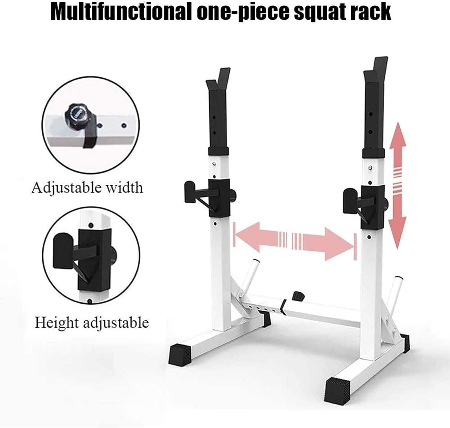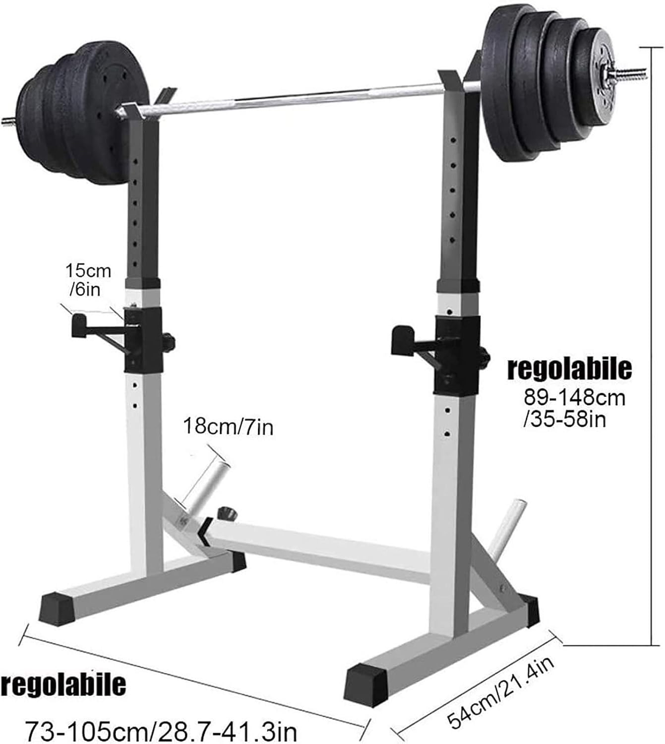 You can use this squat rack at home to exercise your arms, abdominal muscles, legs and chest muscles. You can not only stay healthy but also get a perfect body. It can be used as an independent fitness equipment or in combination with a barbell and bench press rack. Specifications: Name: Adjustable Squat Rack Material: High-quality steel pipe Adjustable: Width/Height Anti-slip pad: Rubber feet ensure that the floor is not scratched Height adjustment: 89-148 cm Width adjustment: 73-105 cm/28.7-41.3 inches Maximum load-bearing capacity: 260 kg Weight: Approx. 15 kg Tube diameter: 50MM * 50MM Note: 1.Due to different measuring instruments and methods, there may be an error of 1-3cm! Please understand. 2. We only sell racks, not barbells, benches and other reference items. For safety reasons, please check that the nuts are tightened before use. 3. This device must be used on a level surface. 4. Before each use, check that the locking pin is fully engaged and that all screws and nuts are properly tightened.