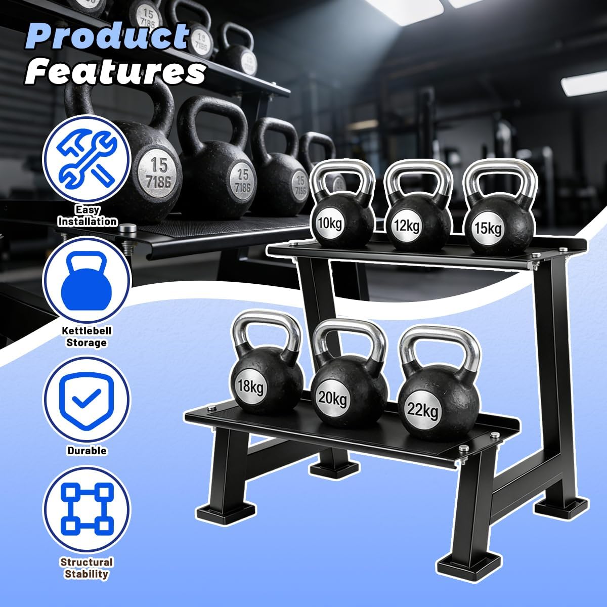 ParametersName: Kettlebell Storage RackMaterial: IronColor: BlackApplication: More than just a kettlebell rack, it perfectly accommodates dumbbells, yoga blocks, and other fitness equipment, helping you maintain an organized, clutter-free training space.Package Contents2 tiers kettlebell storage rack x 1 pcsNoteDue to extended shipping times, individual items may exhibit minor imperfections. Should you encounter any defective products, please contact us promptly for replacement.As dimensions are measured manually, actual product measurements may slightly differ from those listed above.Slight color variations may occur due to monitor settings, camera settings, or other factors.