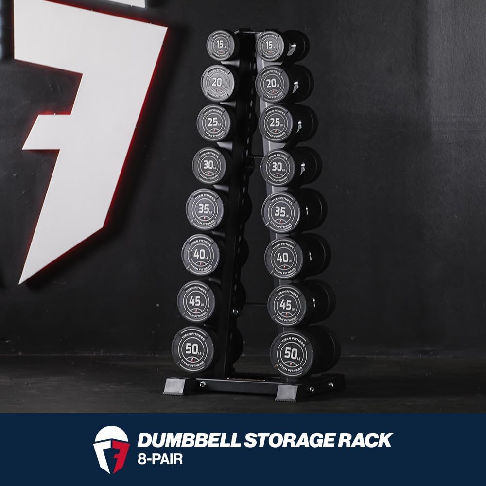Keep your gear organized and off the floor with this space-saving dumbbell rack, available as a 5- or 8-pair setup. The 5-pair rack can be configured as a compact A-frame or sleek tower, letting you organize your gym your way while reclaiming floor space. The 8-pair rack features a sturdy A-frame to keep your workout area streamlined. A non-slip base keeps your rack stable under heavy load. No wobble, no tipping - just solid support.Ergonomic cradles with bumper edges make loading and unloading simple, protecting your fingers and dumbbells from damage. The 5-pair rack supports dumbbells up to 50 LB per cradle (500 LB total), while the 8-pair rack supports up to 50 LB per cradle (600 LB total).FEATURES:- 8-tier dumbbell storage rack- A-frame configuration- Holds 16 dumbbells up to 50 LB each- Protective bumper cradles- Non-slip base for stabilitySPECIFICATIONS:- Overall Height: 58-in.- Overall Width: 23-in.- Overall Depth: 21.25-in.- Dumbbell Resting Width: 4.25-in.- Finish: Powder-Coated Black- Material: Steel- Capacity Holds: 8 Pairs (max 50 LB per pair)- Weight Capacity: 600 lb.- Product Weight: 68 lb.