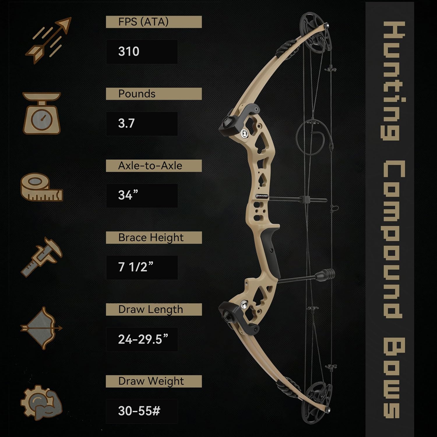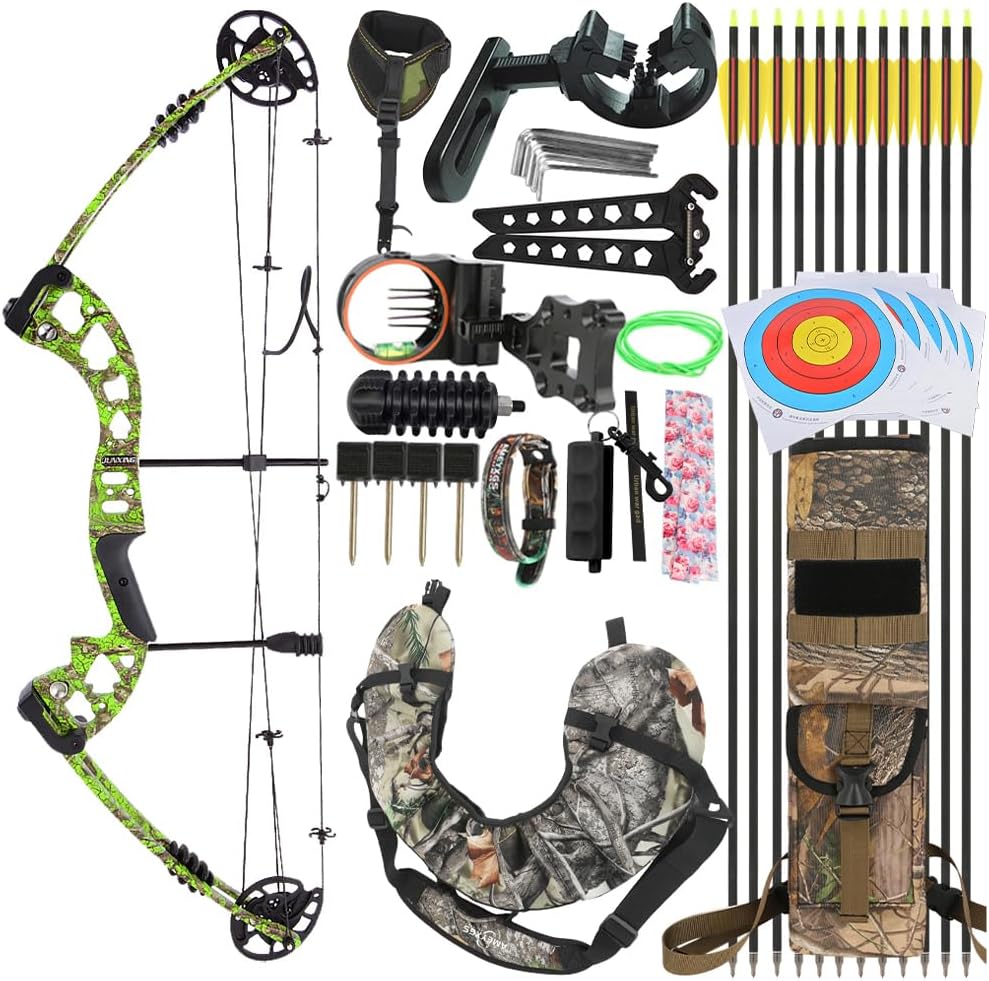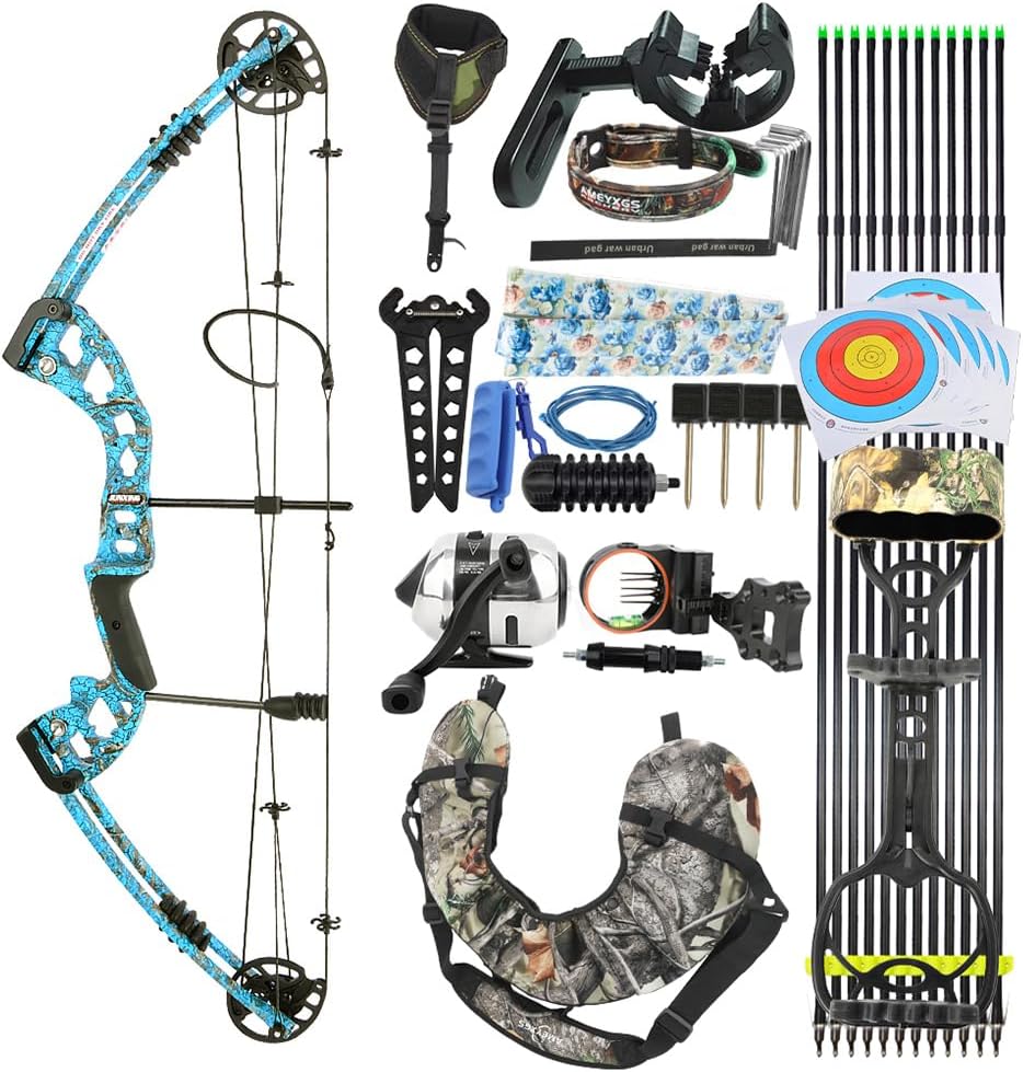 Name: Compound Bow Colors: Army Green, Earth Color, Snake Skin Blue, Black, Camouflage, Snake Skin Green Package Weight: Approx. 2490g Product Weight: Net weight 3.7 lbs (approx. 1678g) Material: High-strength metal alloy, high-strength fiberglass limbs Axle-to-Axle: 34 inches Brace Height: 7.5 inches Draw Weight: 30~55 lbs Draw Length: 24-29.5 inches (Adjustable without a bow press) Let-off: 70% IBO Speed: 310 fps Product Dimensions: 93 x 30 x 5.5 cm Package Dimensions: 99 x 33 x 7.5 cm Bowfishing Kit: 1xCompound Bow (Left/Right Hand) 12x Target Papers (40×40cm) 12x Bowfishing Arrows 1x Arrow Quiver 4x Target Nails 1x Stabilizer 1x Reel Seat 1x D-Loop Rope 1x PC Bow Case 1x Arrow Rest 1x 5-Pin Sight 1x Imperial Wrench 1x Bow Stand 1x Arrow Puller (Rubber) 1x Wrist Sling 1x Safety Tether 1x Grip Tape 1x Bowfishing Reel Archery Set: 1xCompound Bow (Left/Right Hand) 1x Bow Stand 1x Wrist Release 1x Wrist Sling 1x PVC Oxford Cloth Arrow Quiver 1x Imperial Wrench 1x PC Bow Case 1x Arrow Rest 1x 5-Pin Sight 4x Target Nails (Metal) 12x Mixed Carbon Arrows 12x Target Papers (40×40cm) 1x Stabilizer 1x Arrow Puller 1x D-Loop Rope 1x Grip Tape