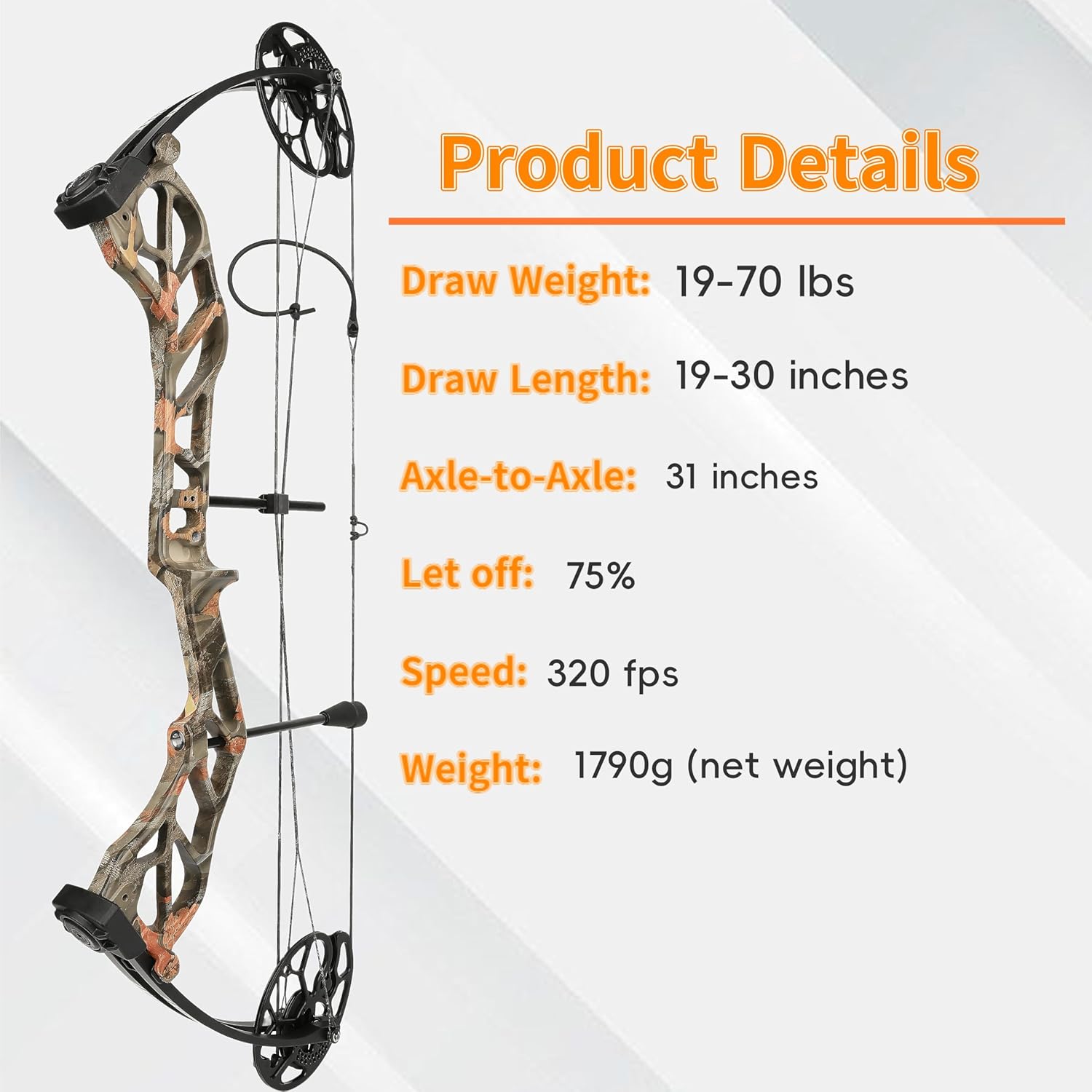 Item Name: Compound Bow Arrow Kit Color: Camo Draw Weight:19-70 lbs,adjustable Draw Length:19-30 inch,adjustable Brace Height :7 inch Axle to Axle:31inch Let-off : 75% IBO arrow speed: 320FPS Bow Riser: aluminum alloy Surface Treatment: Spray, Camo water transfer printing. Cam: Double, adjustable,6061-T6 CNC machining,with bearings Main String Length:58.68 inch Cable Length: 33.938 inch × 2 Bow Size: 87.5x31.5x5.7cm Bow Net weight: 1.7kg Package Include: 1x Compound Bow 5x Target paper 6x Carbon arrows 6x Arrowhead 6x Target Nial 1x Bow bag 1x Arrow Puller 1x Sight 1x Wrist sling 1x Release aids 1x Arrow rest 1x Riser stabilizer 1x Wrench 1x Bow stand 1x Arm Guard 1x Bowstring wax