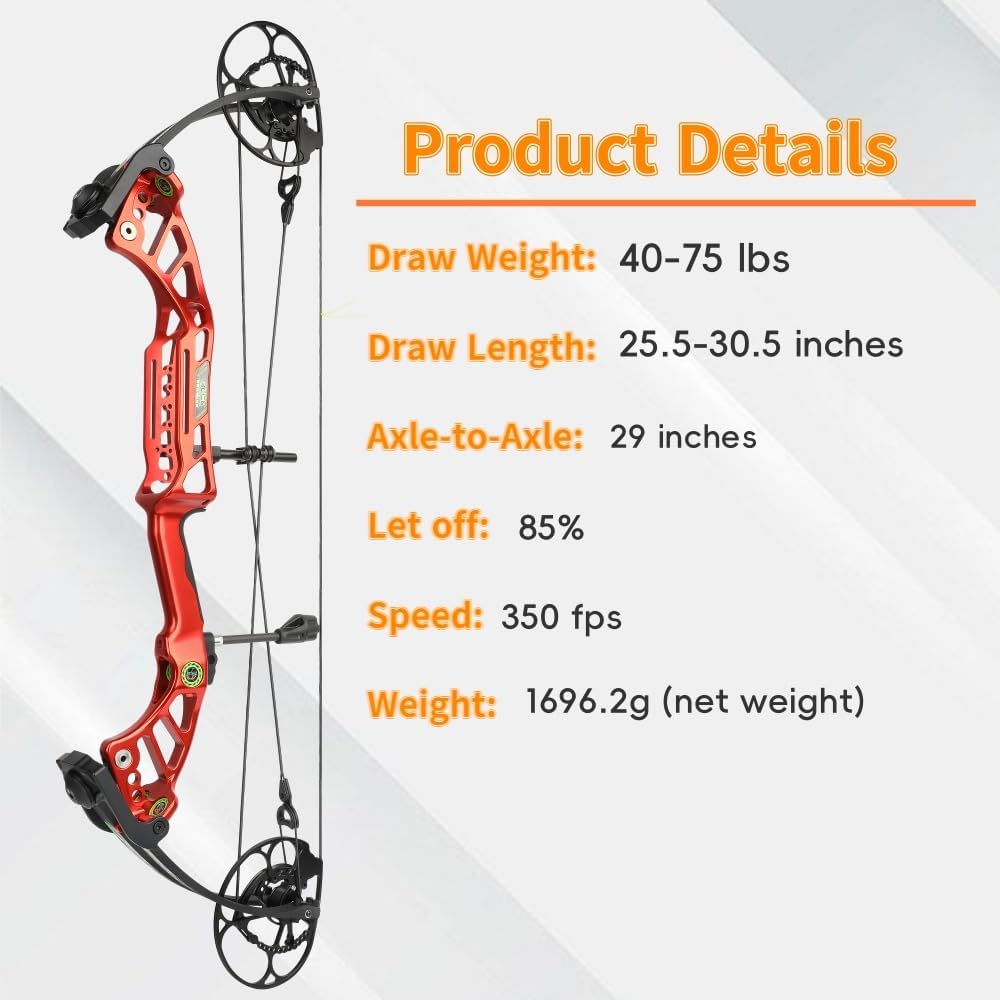 Item name: Compound Bow Color: Red Material: Alloy Draw length:25.5-30.5inch Draw weight:40-75(adjustable) saving ratio:85% Weight:about1.7kg Package weight:about2.5kg Arrow speed:350FPS Product size: 87.8*25.7*7.5cm Package size:110*34*13cm Package include: 1 x Composite Bow 1 x Arrow Stand 1 x Archery Release Device 1 x Shock Absorber 1 x Arm Guard 1 x Wrist Rope 1 x String Wax 1 x Quick Release Arrow Box 1 x Wrench 1 x Five Needle Sight 1 x Bow Stand 1 x Arrowhead Box 5 x Arrowheads 6 x Target Nails 6 x Target Paper 1 x Bow Bag 6 x Carbon Arrows