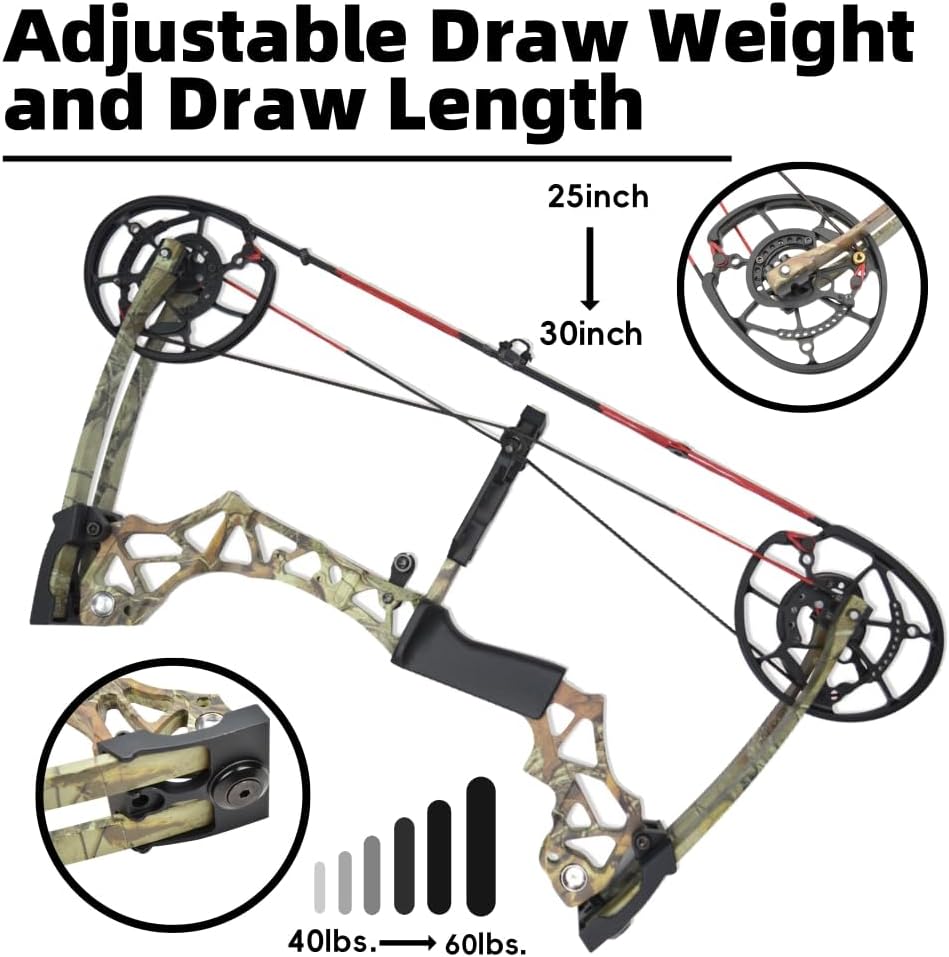 | Included Components | 1 x arm guard 1 x arrow puller 20 x steel ball 1 x string wax 1 x wrist sling 1 x stabilizer, 1 x compound bow 1 x bow stand 1 x 5-pin bow sight 1 x arrow rest 1 x Allen wrench 1 x bow release aid 1 x bowstring wax |