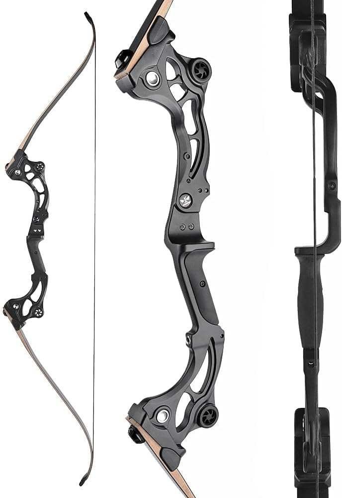 Color: Black Bow Length: 64 inches Bow Weight: 3.16 lbs Draw Weight: 30-55 lbs (in 5 lb increments) Handle Length: 59cm Limb Size: 62x3.9x1.3cm Brace Height: 7.5 inches - 8 inches Max Draw Length: 32 inches Materials: Aluminum-magnesium alloy handle, bamboo and fiberglass laminated limbs Packaging list: [ONLY BOW] 1x recurve bow 1x arrow rest 1x wrench 1x Bow Stringer Bow Packaging Dimensions: 67.4x18.2x6cm Packaged Weight: 1760g [BOW SET] 1 x recurve bow 1 x arrow rest 1 x wrench 12 x carbon arrows 1 x Bow Stringer 1 x arm guard 1x finger guard 1 x recurve bow bag 1x sight 1x bow stabilizer They will sent in two packages ●This recurve bow is a high-quality archery equipment designed for archery enthusiasts and professional athletes. With a pull range of 30-55 pounds, this recurve bow gives you flexible options to suit different archery needs and skill levels. ●Our recurve bows feature a handle made of aluminum-magnesium alloy, which is a durable material, while the lightweight design makes the handlebar easier to hold and handle. Its superior corrosion and oxidation resistance ensures a long service life. ●The bow blade is made of bamboo sheet fiberglass, and this combination of materials gives the bow blade excellent elasticity and durability. The fiberglass structure of the bamboo sheet provides better bow rebound speed and a more stable arrow flight trajectory, helping you to achieve more accurate shooting performance. ●In addition, our recurve bows are equipped with a comfortable grip design and ergonomic handle, so that you can feel better grip comfort and shooting stability when holding the bow. Whether you are a beginner or an experienced archer, this recurve bow has you covered.