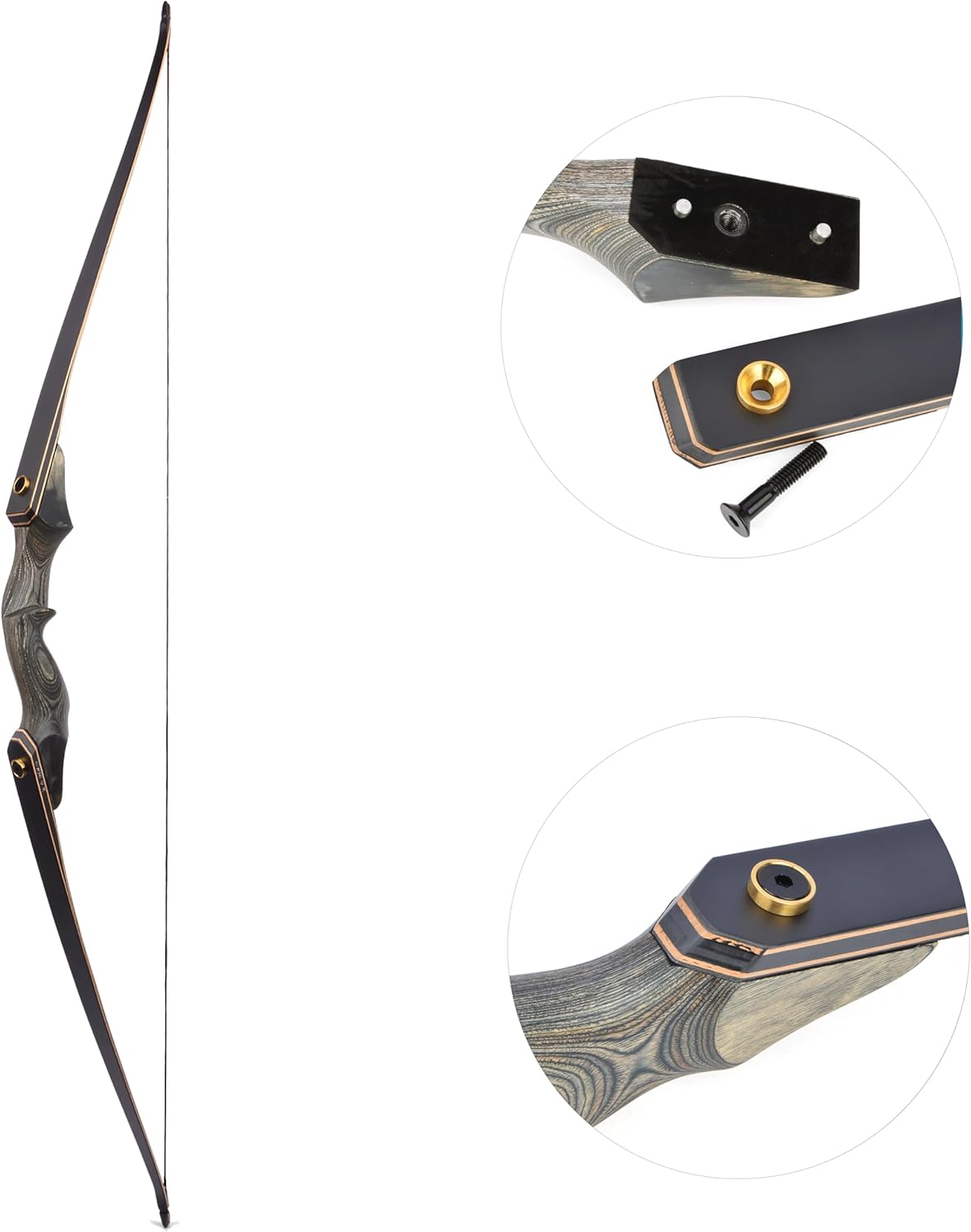 Description: Bow length: 60 inchesBow handle: 15 inchesBow handle material: tech woodBow limbs material: fiberglass slice + maple in the middleWeight: 25-50 lbs (5 lbs incremental decrement)Bow handle weight: 632.5gBow limbs weight: 463gNet weight of the whole bow: 1148gWeight with package: about 1324gProduct size: 149×22×4cmPacking size: 68×17×6cm Factory configuration: bow handle, bow limbs, bowstring, 1*fur arrow rest, 1 wrench, 2 screws User notice: This product is professional archery equipment, not a toy. Minors are not allowed to use. It is forbidden to release the arrow without string to avoid damaging the equipment or causing injuries. Arm and finger pads are recommended.