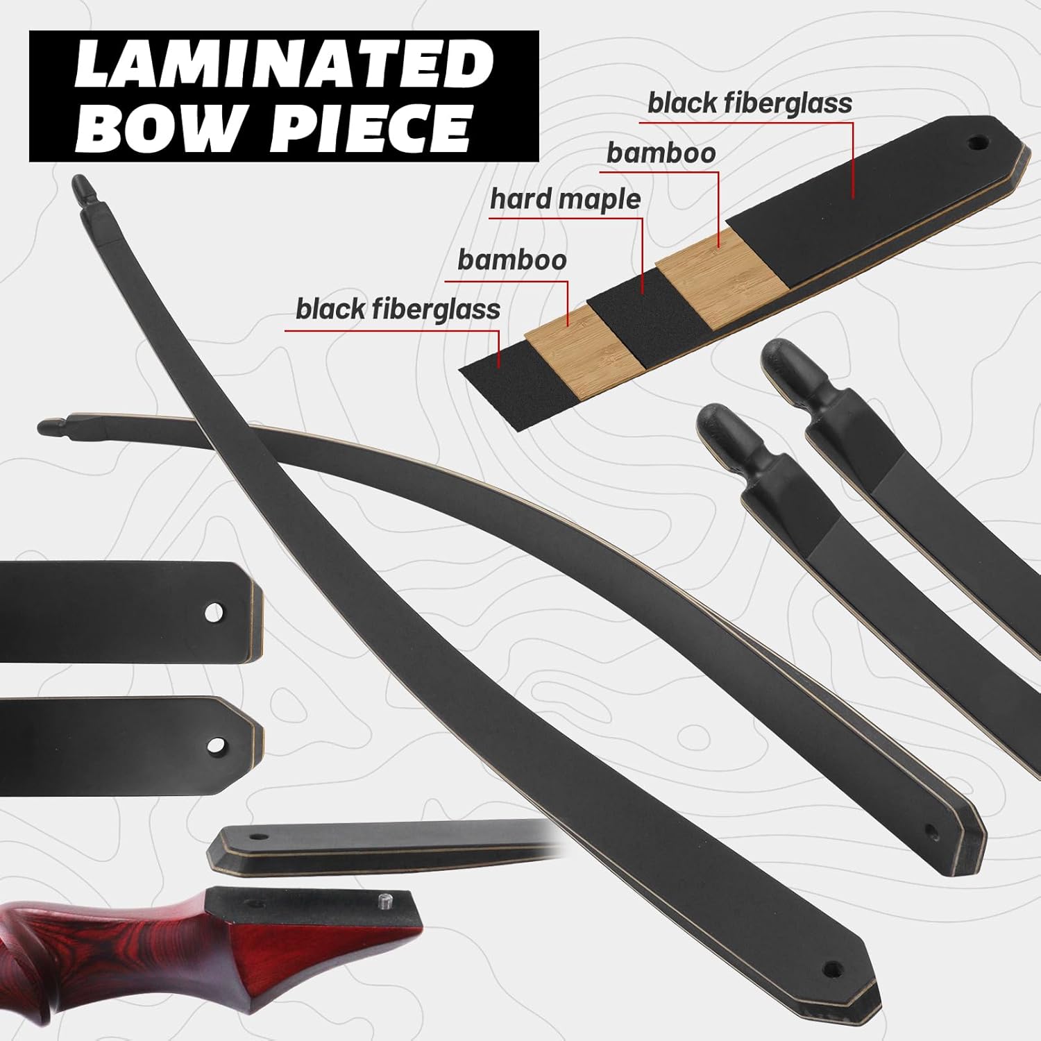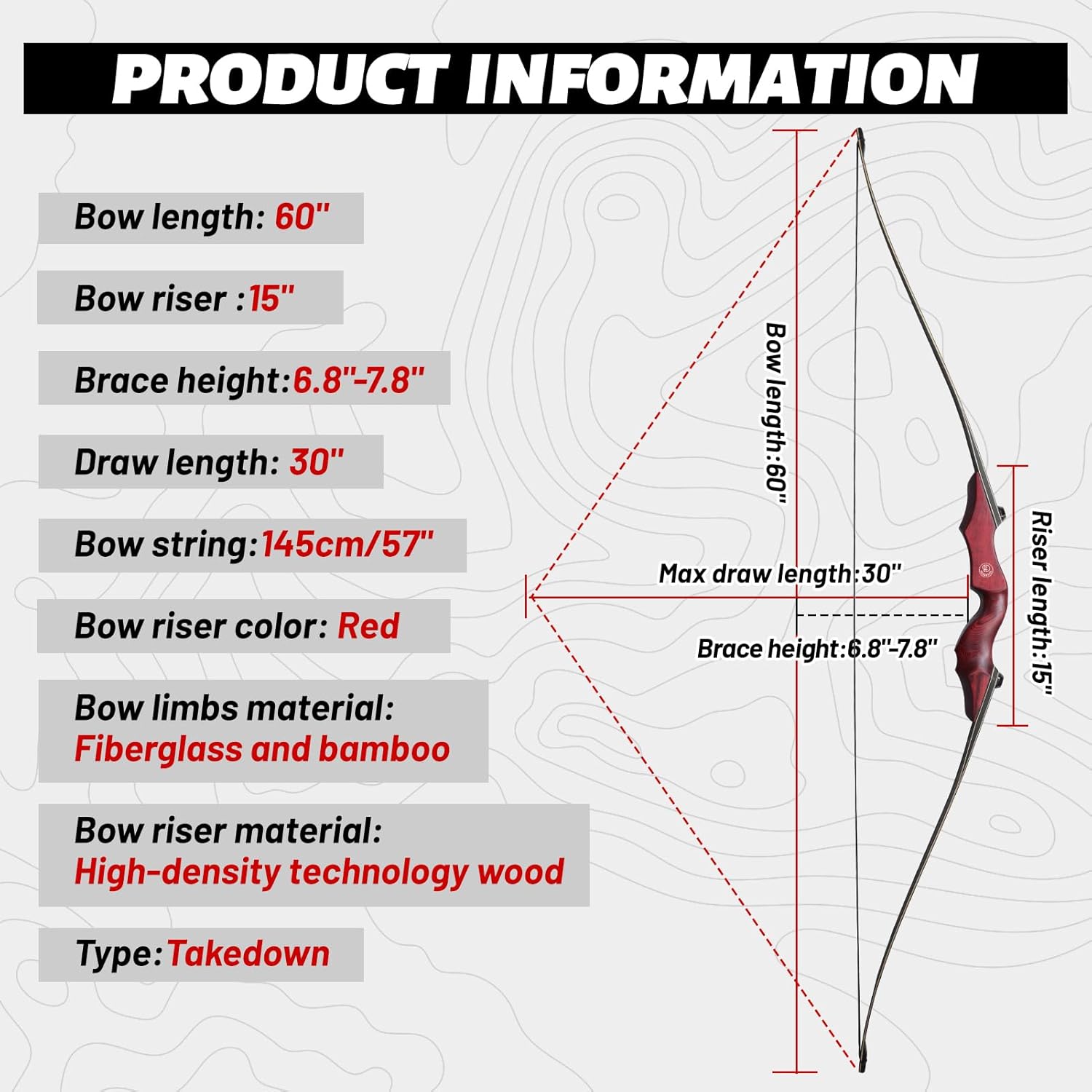 Product Features: Bow riser color: Red Bow limbs color: Black Bow riser material: High-density technology wood Bow limbs material: fiberglass, hard maple and bamboo sheet (German lamination process) Bow length: 60 inch Bow riser length: 15 inch Max draw length: 30 inch Bow string: 57 inch Brace height: 7.5 inch Type: takedown Packing List: 1 hunting longbow 3 arrows 2 bowstring silencers 2 limb silencers 1 arrow rest 1 arm guard 1 finger guard 2 nocks 5 target papers 1 bow stringer User Notice: NEVER DRY FIRE (shooting without an arrow). Do not exceed the draw weight, or it will damage the limbs. Do not attach the arrow to the bow for a long time, or it will reduce the draw weight. Due to differences in manual measurement and display, there may be slight errors in color and size. Thank you for your understanding.