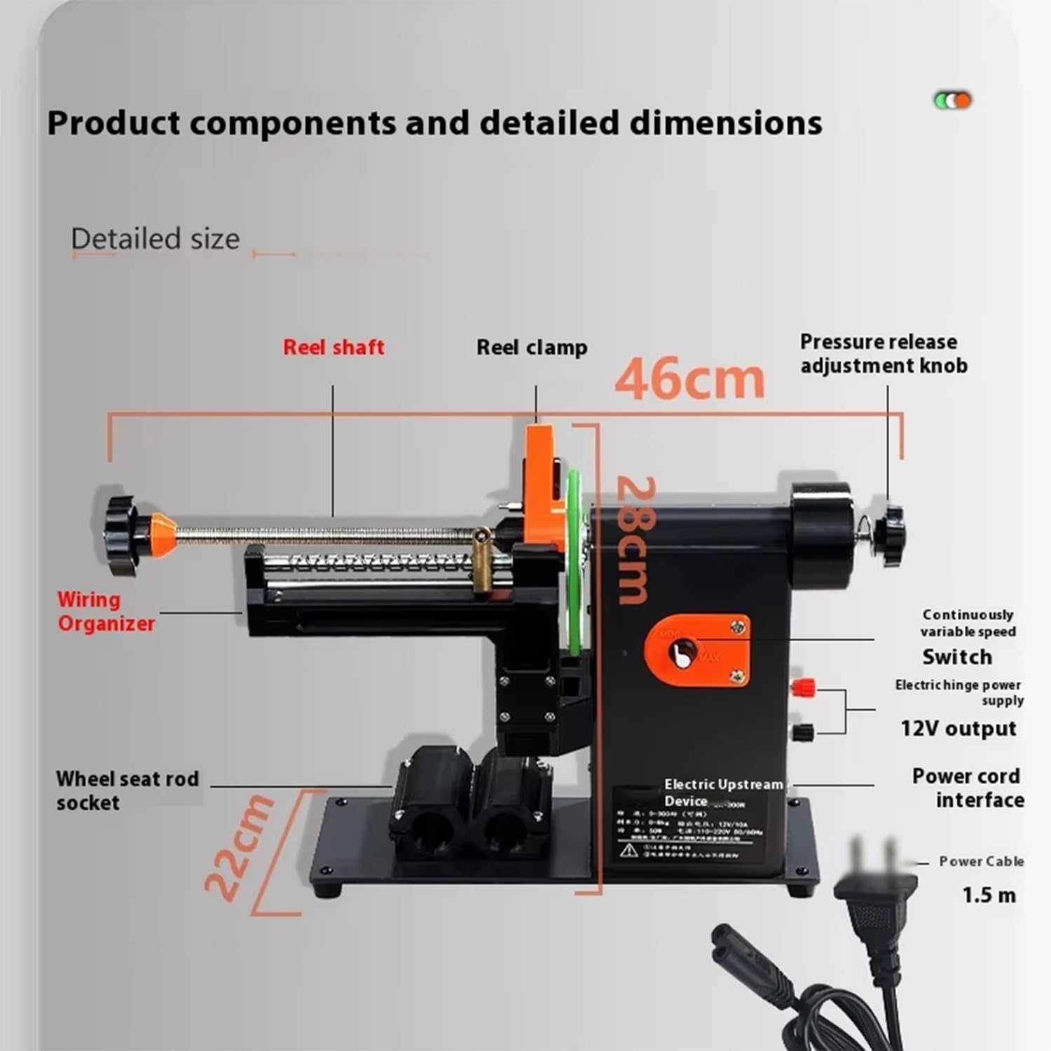 Experience a seamless fishing experience with our efficient fishing line spoolers, designed to eliminate the frustrations of line tangles, balling, and twisting. Constructed with durable materials including aluminum alloy, stainless steel, and nylon, this spooler is built to last. Key specifications include a power output of 50W, compatible with a power supply of 110-220V, and a braking force adjustable from 0-8kg. The device features speed adjustment, damping brake, and a meter for precise control while operating in electric mode. With a speed range of 0-300, a wheel rod length of 230mm and diameter of 12mm, the overall dimensions of the spooler are 98cm x 46cm x 28cm. Included in the product package is one fishing line spooler.