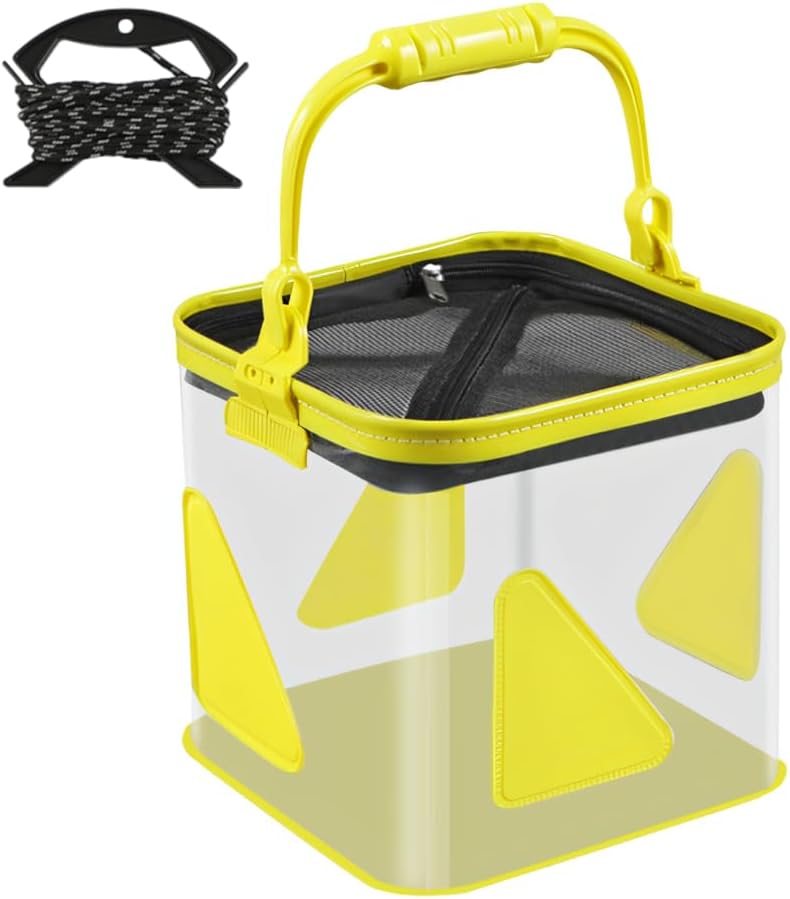 Features:1.【Convenient Fishing & Anti-Escape Design】: The upper is equipped with a mesh cover and a zippered fishing port, which is easy to open and close and allows for quick fishing. The zipper seals well after closing to avoid live fish from jumping and escaping, while maintaining ventilation and ensuring the fish's breathing.2.【Detailed Design】: Two-way metal zipper, enlarged zipper opens and closes smoothly and does not get stuck easily, external storage pocket can store accessories and hang an aerator, and a new aerator hole is added to oxygenate the fish at any time.3.【Ergonomic Grip System】: The handle adopts a widened arc design, which fits the natural curvature of the palm and disperses pressure. The surface is treated with anti-wear, so it will not pinch or slip when lifting water or carrying heavy loads, and it is still comfortable to carry for a long time.Specifications:Weight: 40cm: 800g30cm: 500g24cm: 500gMaterial: EVA + Steel Wire + PVCSize: 40cm: 40*24*24cm, 15.75*9.45*9.45inch30cm: 30*20*20cm, 11.81 *7.87 * 7.87 inch24cm: 24*24*24cm, 9.45*9.45* 9.45inchColor: 40cm Transparent + Yellow, 40cm Transparent + Blue, 30cm Transparent +Purple, 30cm Transparent + Yellow, 24cm Black Triangle, 24cm Yellow TrianglePackage List:1 * Live Fishing BucketNotes:1. Due to the difference between different monitors, the picture may not reflect the actual color of the item. We guarantee the mode is the same as shown in the pictures.2. Please allow 1-2cm slight dimension difference due to different manual measurement.