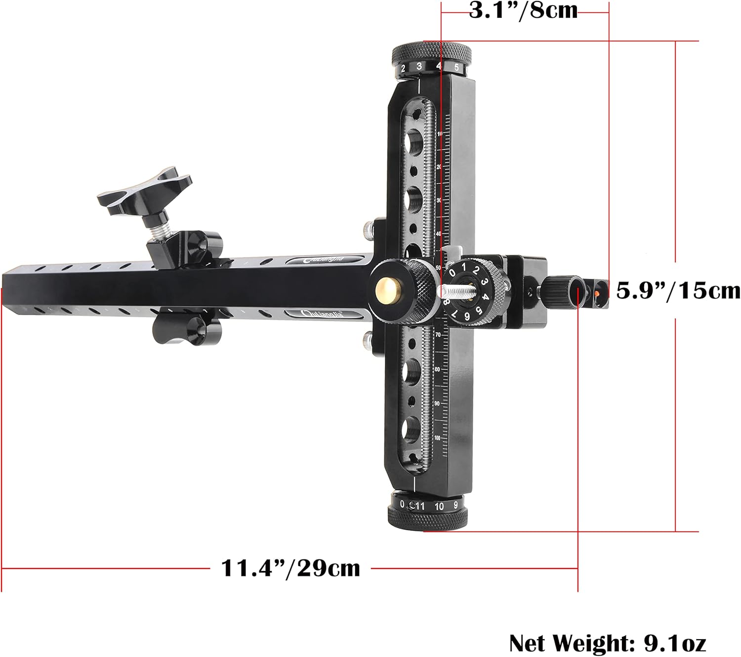 Item Name: Recurve Bow Aluminum T Shape ▲Material: Aluminum Alloy ▲Color:Black ▲Pin: 1 pin ▲Net weight: 9.1oz / 258g ▲Product size: 29x15x8cm ▲Package Size: 28.8 x 19.7 x 4.2cm ▲Application: Fit for ecurve bows, easy to install and disassemble. Package includes: 1 x recurve bow sight Product Features: 1. Quick release, quick vertical adjustment. 2. Windage and elevation adjustment 3. Right handed archer is available.