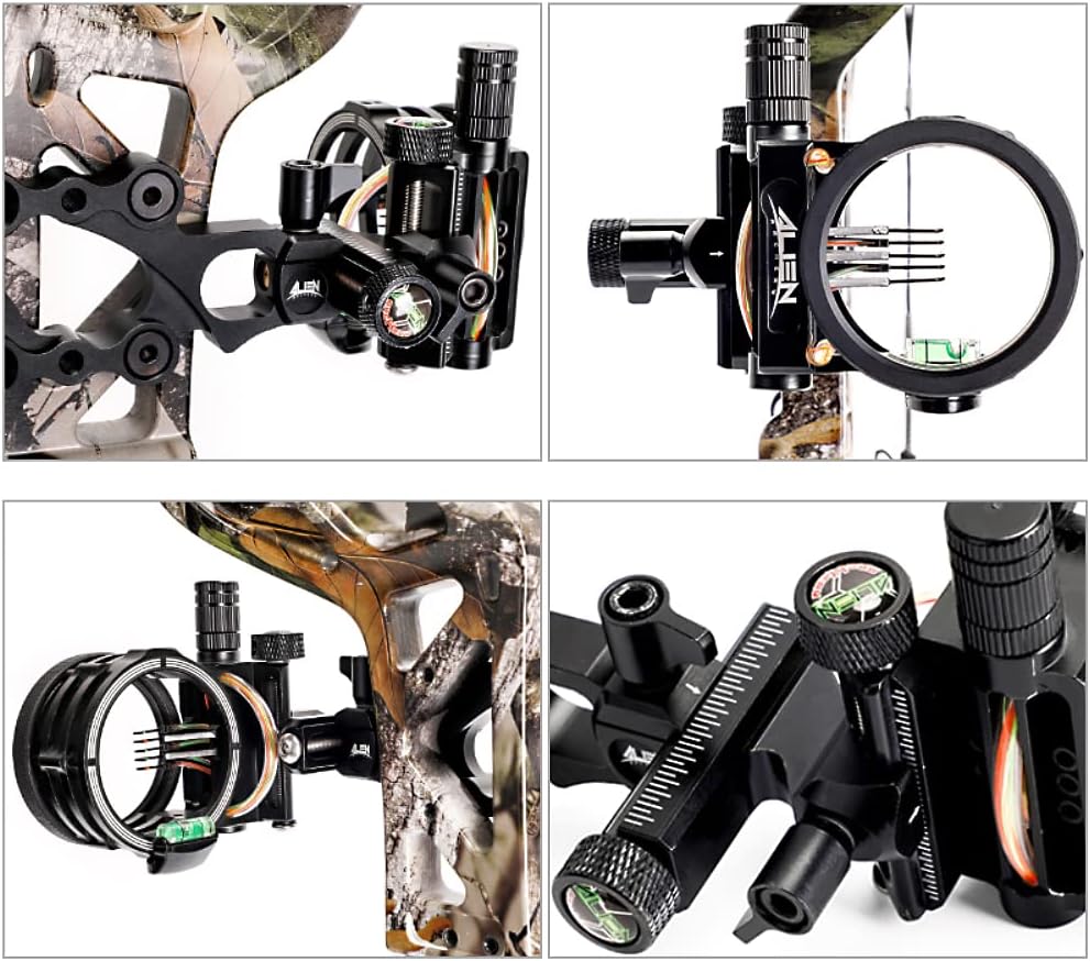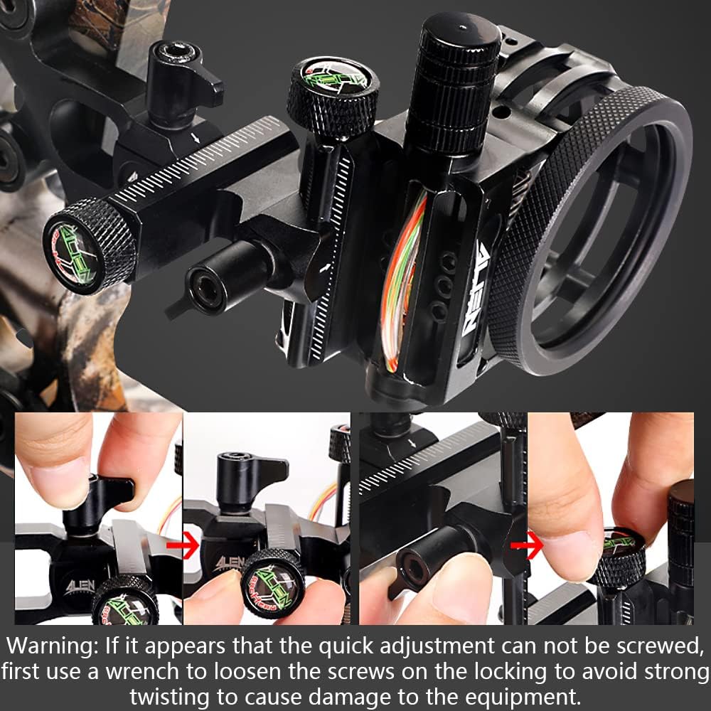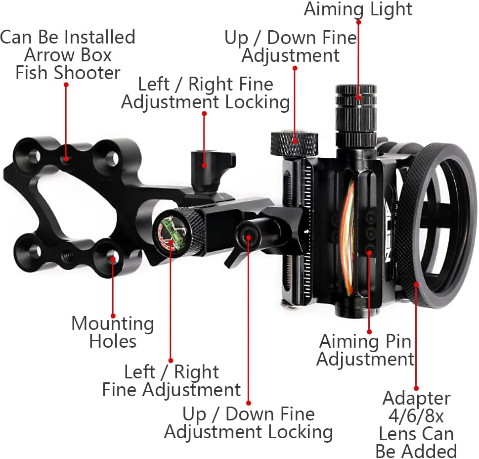 Trade name. 5 Pin Bow Sight, Aluminum Adjustable Fiber Spacing Archery Sight, Support 4 Sided Fine Tuning Scale Clear for Right and Left Handed Mountable Lenses Peep Sight Material: CNC aluminum machining Product weight: 196.2g Package weight: 273.1g Product size: 15 x 10.8 x 8 cm 5.9 x 4.25 x 3.14” Package size: 25 x 19.7 x 7 cm 9.84 x 7.75 x 2.75 Product features. 1. Locking structure, four-way micro-adjustment. Loose latch can be adjusted up and down according to demand, the adjustment will be accompanied by a ticking sound to remind. Tighten the latch can not be fine-tuned, no tools, you can easily adjust the archery sights. 2.bow sight comes with an adapter (can be retrofitted with 4/5/6x lens, the lens can be removed at will, the product does not come with a lens, need to buy separately). 3. bow peep sight uses 5-pin 0.019" fiber optic sight pin, adjustable spacing, easy to use. 4. bow sight scale is accurate and clearly visible. 5. bow sights support left and right universal. Ps: the above parameters are manually measured will be inaccurate, the specific information in kind.