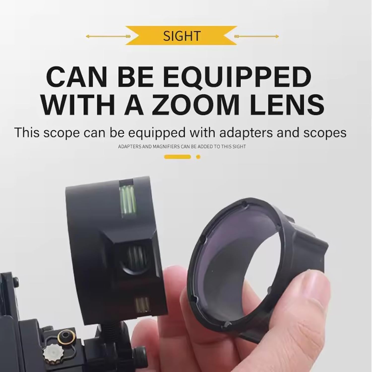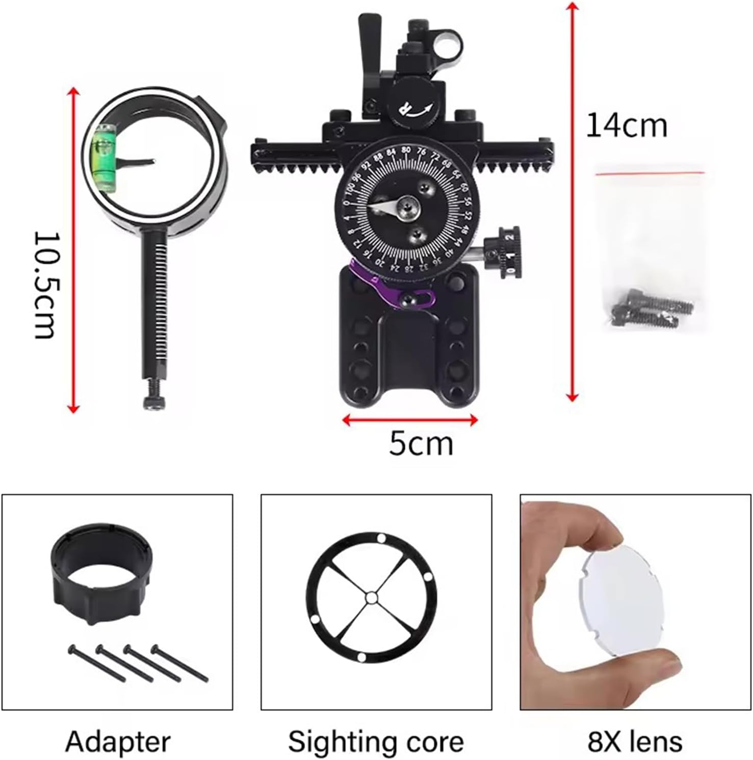 Specification:Product Name: Bow SightMaterial: Aluminum AlloyColor: BlackLens: 4x/6x/8xSize: 13.8*10.5*4cmWeight: 383gUsed for Compound BowPacking: Compound Bow Sights * 1Adapter * 1Lens * 1