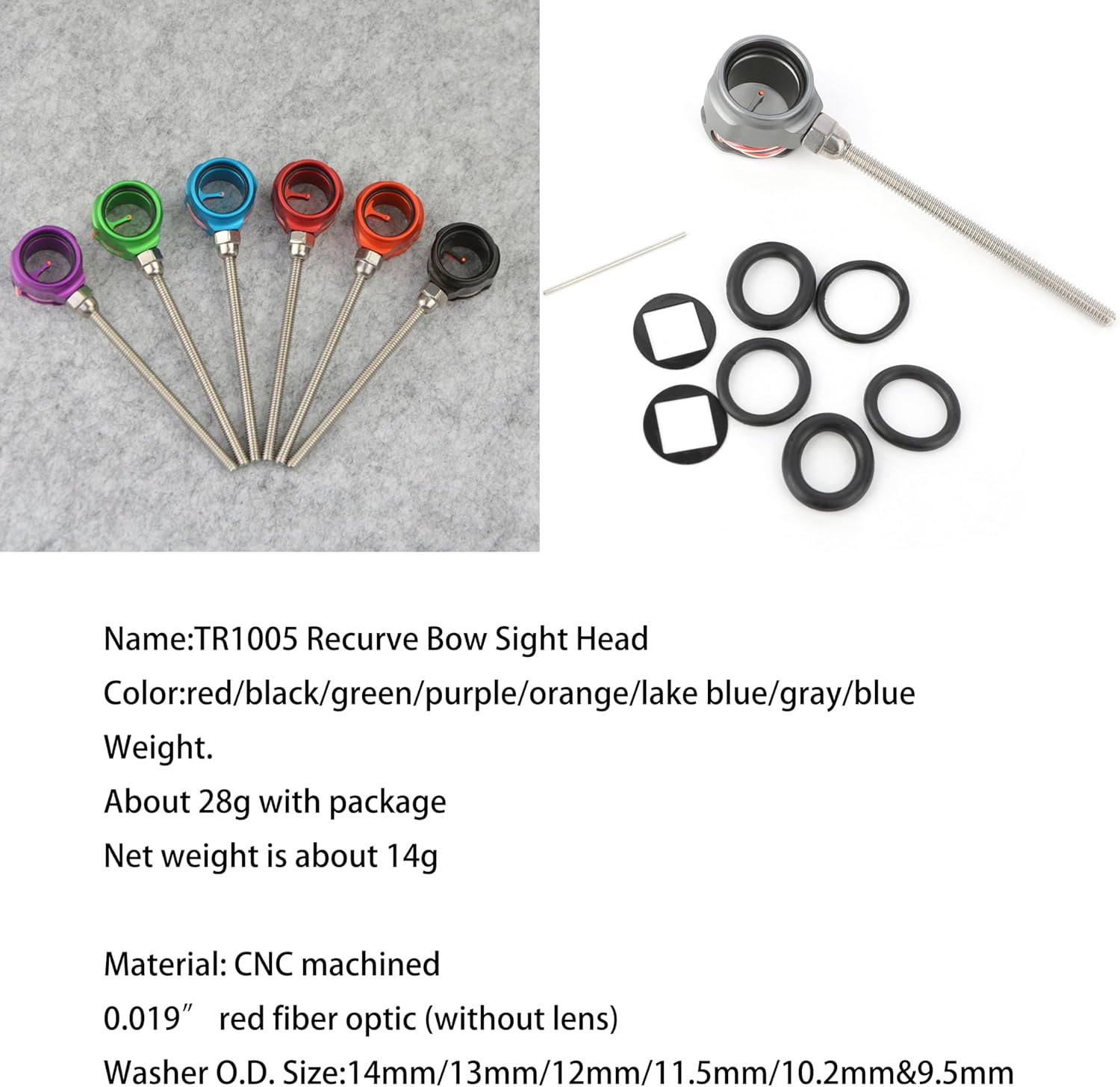 Name:TR1003 Professional Athletic Recurve Bow Sight-Guard Model:TR1003 Color:red,black,grey,blue,green,purple,orange,lakeland Material:Carbon Fiber Bracket,Aluminum Alloy Features. 1. Vertical fast adjustment, left and right fast adjustment 2.Pie horizontal axis and vertical axis with fine-tuning knob, each rotation of a grid moves about 0.1mm 3. Comes with standard threaded 8#-32 silk rod aiming head 4.Left and right hand versions available Name:TR1005 Recurve Bow Sight-Head Color:red/black/green/purple/orange/lake blue/gray/blue Package Size:15.5*7.5*2.5(cm) Weight. About 28g with package Net weight is about 14g Material: CNC machined 0.019” red fiber optic (without lens) Washer O.D. Size:14mm/13mm/12mm/11.5mm/10.2mm&9.5mm