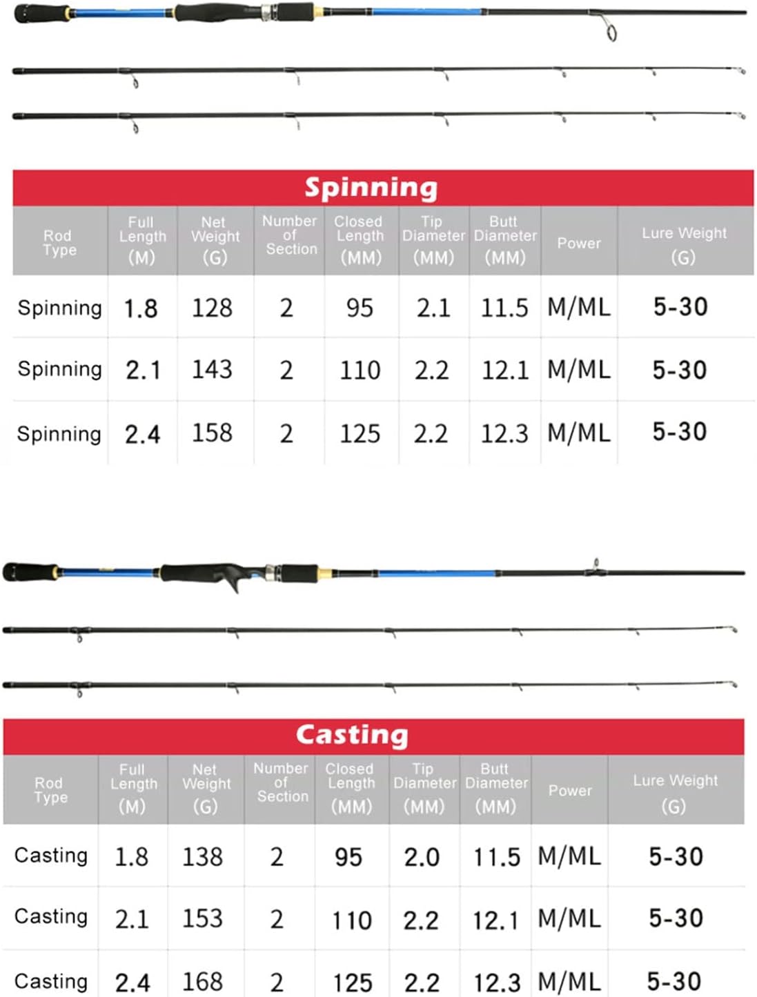 This is the best gift for fathers, sons, husbands, friends and friends on important holidays such as Christmas and New Year. Double Tips Spinning Casting Carbon Fibre Fishing Rod 1.8/2.1/2.4m Lure Rod M+ML Power for Saltwater Freshwater Name: Fishing Rod Type: Spider/Casting Material: Carbon Closed length: 95/110/125 cm Total length: 180/210/240 cm Number of sections: 2 sections Tip diameter: 2.1/2.1/2.2/2.2 mm. Shank Diameter:11.5/12.1/12.3mm Rod power: M + ML (two tips). Bait weight: 5-30 g. Test weight: 6 kg. Net weight: 128-168g Package includes: 1 x fishing rod. Note: 1. Please check the size before purchasing. Due to manual measurement, there may be an error of 0-5 mm. 2. Except for the fishing rod, the other accessories in the picture are not included. 3. Please note that there may be slight colour differences due to different monitors. Thank you for your understanding. 4. The above data is for reference only, the size is measured manually, each variable may be different, please refer to the actual product, thank you. 5. Due to long-term transportation. If the item is damaged, please contact us immediately before leaving a review. Thank you for your understanding! 6. Welcome your exchange and feedback so that we can offer you better products and services. 7. When you visit my store, click to enter my store. There are many products for your reference.