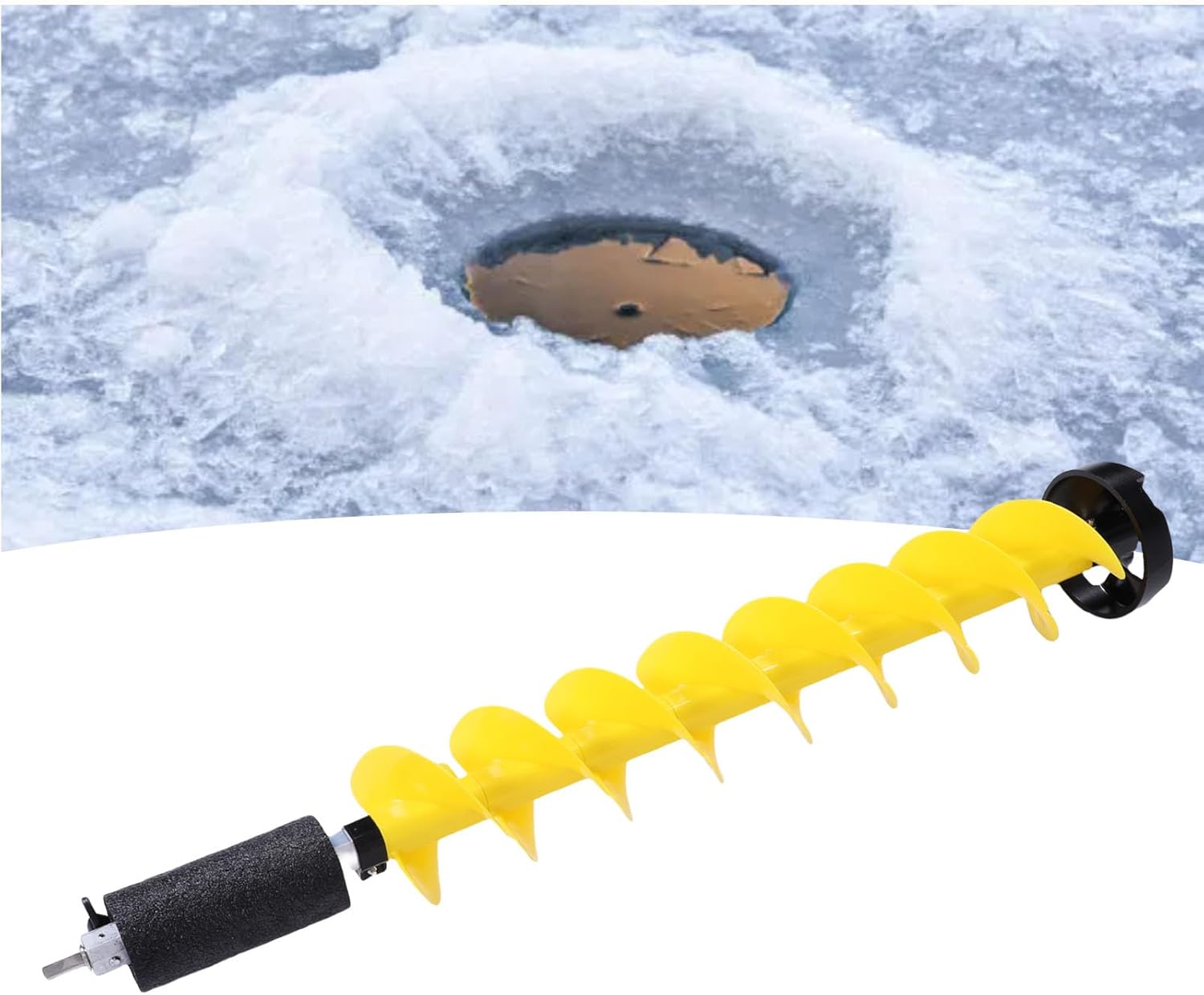 1. Nylon Construction: This ice auger is crafted from lightweight yet heavy duty nylon material, offering well tensile strength, impact resisting, and rustproof properties. It remains flexible even in low temperature ice drilling 2. Adapter and Floating Tube: The auger features a versatile adapter that connects with various electric drills for easy control. Its floating tube design ensures the drill stays afloat if detached, preventing loss in deep water 3. Alloy Steel Blades: Equipped with alloy steel blades, this drill bit cuts through thick ice effortlessly. The upgraded aluminum alloy rotating head enhances durability, while blades guard protects edges from damage, extending lifespan 4. Specifications: With a total length of 41.3 inch and a 6 inch drilling diameter, this auger is suitable for drilling thick ice layers. It is convenient and practical for ice drilling lovers, and compatible with extension pole for deeper drilling 5. Efficient Use: Designed for ease of use, this electric ice auger combines a lightweight build with a powerful drilling mechanism. The 28.5 inch spiral section ensures stable use, making it suitable for versatile ice drilling applications Specification: Item Type: Ice Auger Drill Bit Material: Aluminum Alloy, Hard Alloy, Nylon Total Length: Approx. 1050mm / 41.3in Spiral Part: Approx. 725mm / 28.5in Rotating Diameter: Approx. 150mm / 6in How to Use: Installation and use Package List: 1 x Drill Bit 1 x Blades Guard Cover 1 x Fixing Rope 2 x Blades 1 x Locator 4 x Screws 1 x Wrench