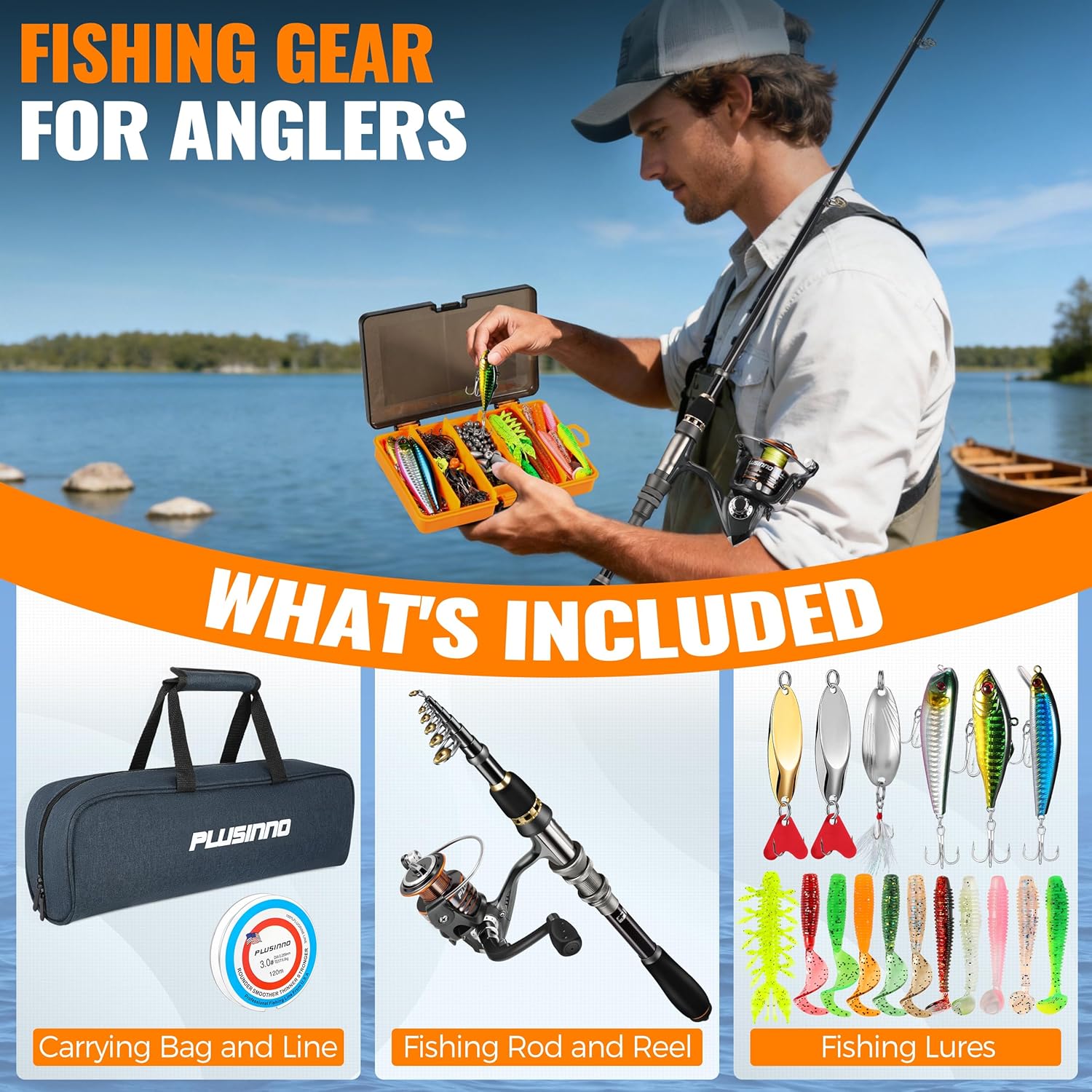 • WHAT'S INCLUDED IN PLUSINNO FISHING ROD AND REEL COMBO - The complete fishing starter kit for adults includes collapsible fishing rod X1, spinning reel X1, carrier bag X1 and 137PCS fishing tackle box with tackle included that allows anglers to start fishing anywhere. Our PLUSINNO fishing rod and reel combo with fishing lures offers a hassle-free, ready-to-go solution to start fishing anytime, anywhere. Perfect fishing gear for who want to learn fishing.