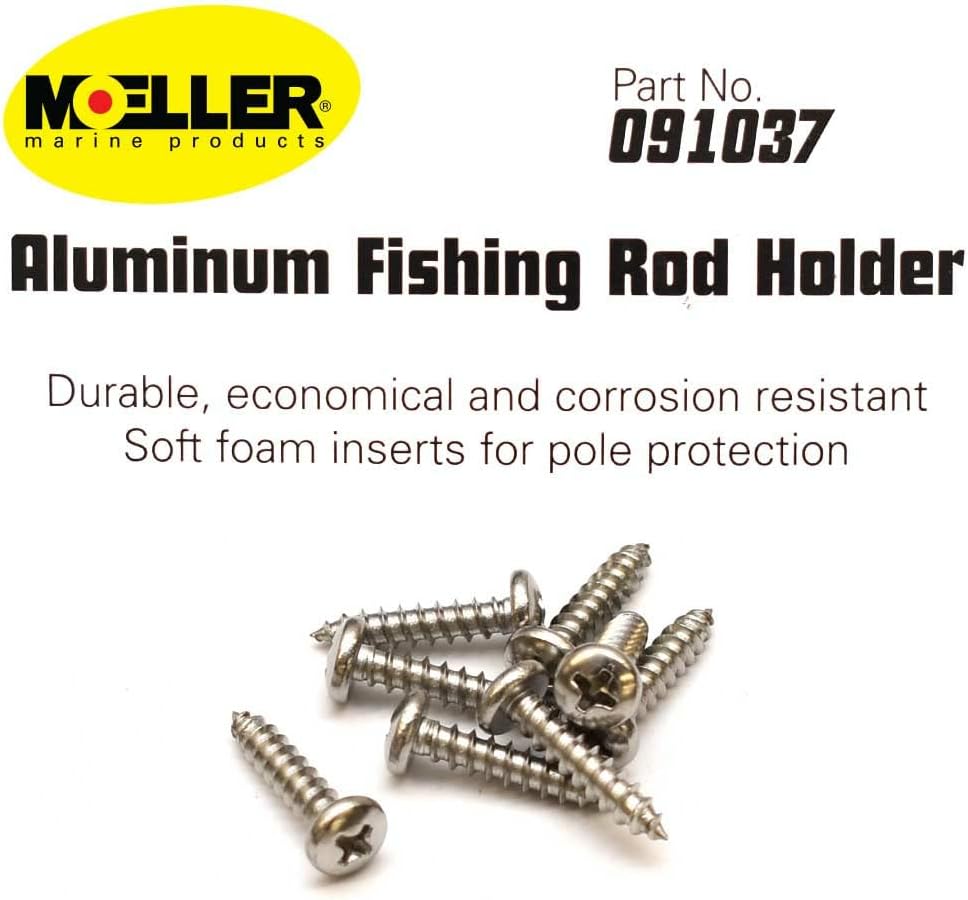 Boat part number 1103143 is a new pair of fishing rod holders from Moeller Marine, part number 091037 .Each of these fishing rod holders are constructed out of aluminum with a gray foam insert and measure approximately 7 7/8" L x 2 1/4" W x 3 1/4" H overall. Mounts using (4) 1/4" Dia. mounting holes set apart 6 5/8" center to center.Sold as a pair.Specifications: Part Manufacturer: Moeller MarinePart Number: 091037UPC: 739729014103Material: Aluminum / FoamColor: Silver / GrayOverall Dimensions: 7 7/8" L x 2 1/4" W x 3 1/4" HMounts: (4) 1/4" Dia. Holes Set Apart 6 5/8" Center to Center Sold as seen in pictures. Customers please note every computer shows colors differently. All measurements are approximate. Instruction / installation manual not included.