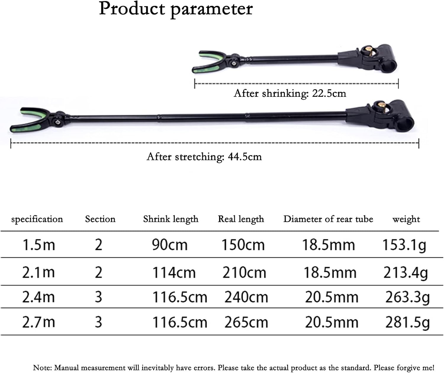 Material: carbon; size: 1.5M, 2.1M, 2.4M, 2.7M; color: red, blue, greenThree-layer paint process with 99% carbon content, 48 processes, a good rod frame, is lightDetachable bracket head, rollers are luminous, 8mm universal interfaceAll-metal positioner, can position the length at will, tighten the screw to positionBold and thick embossed rear tube, non-slip and durableNotice:1. Please check the size before buying. Due to manual measurement, an error of 0-5mm will occur. Please understand!2. Excluding items other than the fishing rod holder shown in the product photos.3. Please note that due to different monitors, there may be slight color difference, please understand.4. The above data is for reference only, the size is manually measured, each variable may be different, please refer to the actual product, thank you.5. If you find any problems with our products, please feel free to contact us by email, we will solve the problem as soon as possible.6. Welcome your sharing and feedback so that we can provide you with better products and services.7. Thank you for visiting my store, click to enter my store, there will be a lot of products for your reference.Great birthday or Christmas gift for your dad, son, husband, fiancé, boyfriend or fishing enthusiast friends who love fishing. Have your rods at the ready when it’s time to go fishing.