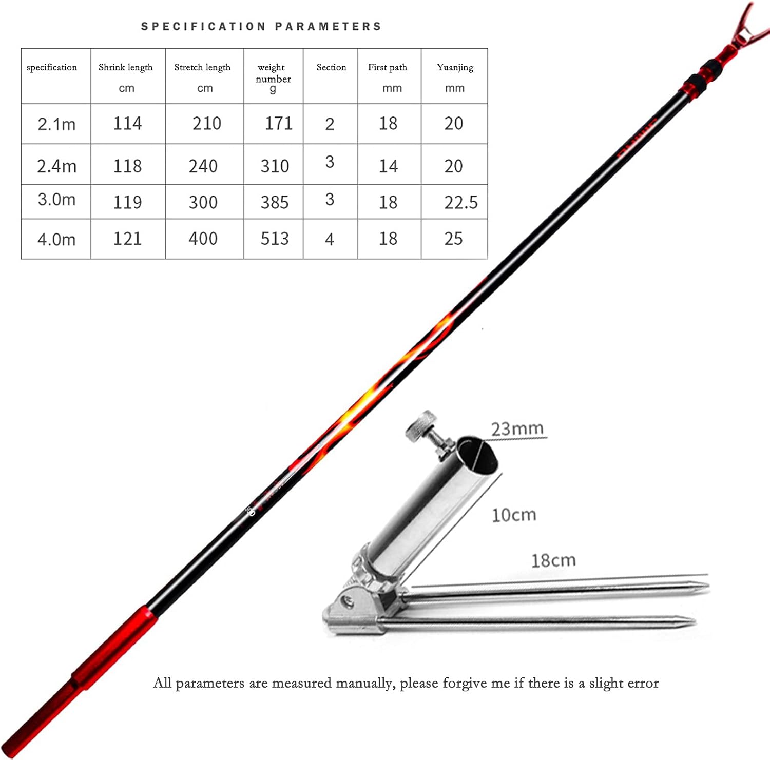 Material: high carbon fiber; size: 2.1M, 2.4M, 3.0M, 4.0MThickened aluminum alloy six-sided rear tube, disassembly design, convenient storageLocking rear hanging clip, free positioning, thicker material, stronger, more stable and firmer buckle19 gears adjustment, gear bite adjustment, not easy to shake8mm universal horn head, electroplated horn head, not on the pole, beautiful and durableNotice:1. Please check the size before buying. Due to manual measurement, an error of 0-5mm will occur. Please understand!2. Excluding items other than the fishing rod holder shown in the product photos.3. Please note that due to different monitors, there may be slight color difference, please understand.4. The above data is for reference only, the size is manually measured, each variable may be different, please refer to the actual product, thank you.5. If you find any problems with our products, please feel free to contact us by email, we will solve the problem as soon as possible.6. Welcome your sharing and feedback so that we can provide you with better products and services.7. Thank you for visiting my store, click to enter my store, there will be a lot of products for your reference.Great birthday or Christmas gift for your dad, son, husband, fiancé, boyfriend or fishing enthusiast friends who love fishing. Have your rods at the ready when it’s time to go fishing.