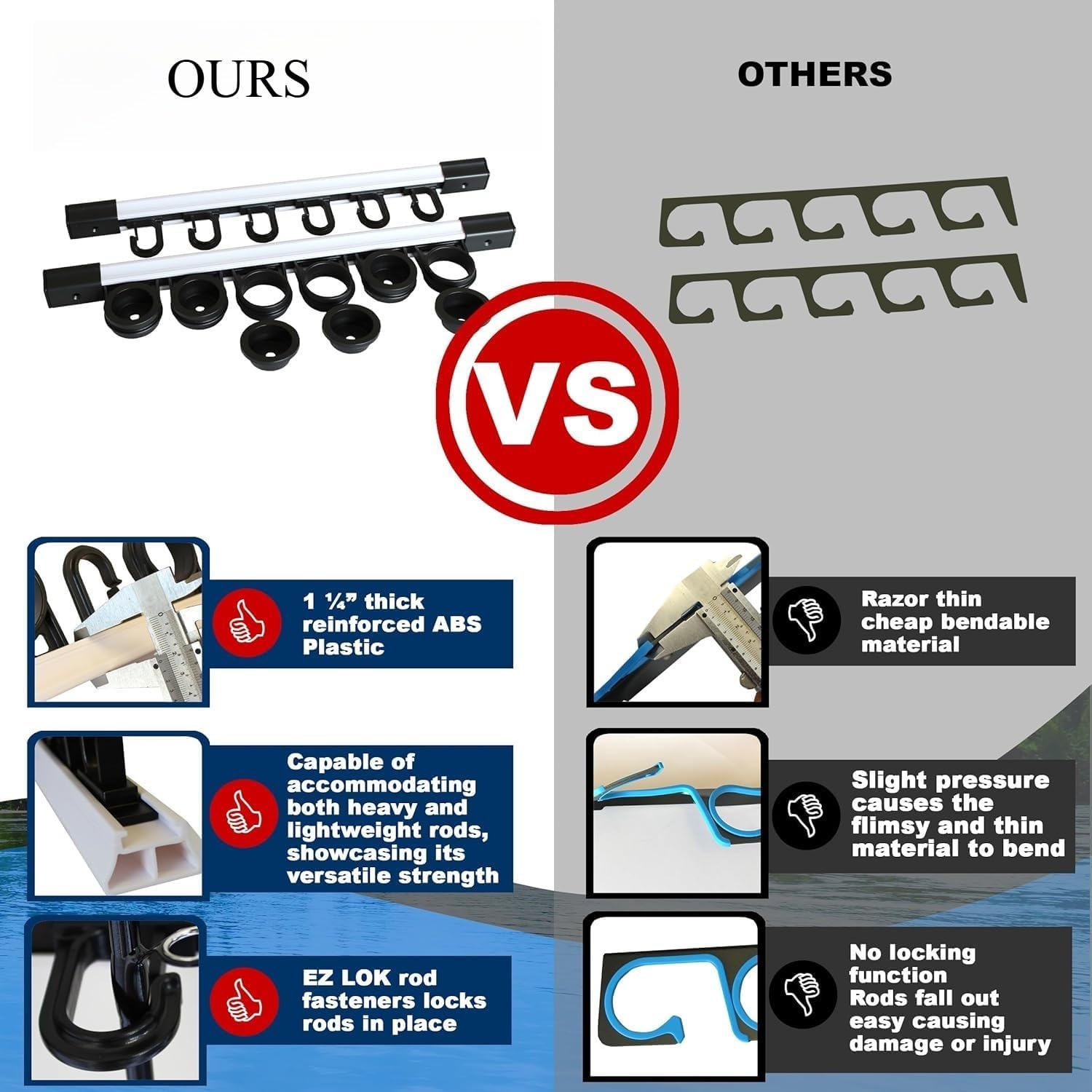 This 6-rod fishing rod holder provides a versatile and durable storage solution for organizing fishing equipment at home or in the garage. Made of strong weather-resistant ABS plastic with a blow-molded build, it supports long-term indoor and outdoor use. The rack can be mounted vertically or horizontally on walls or ceilings, securely holding up to 6 rod and reel combos. Adjustable bracket spacing ensures a proper fit for rods of various lengths, while the expandable sliding design allows upgrading to hold 12 or 18 rods as needed. Easy to install with included hardware, its compact size maximizes storage efficiency, keeping fishing gear tidy and ready for use.