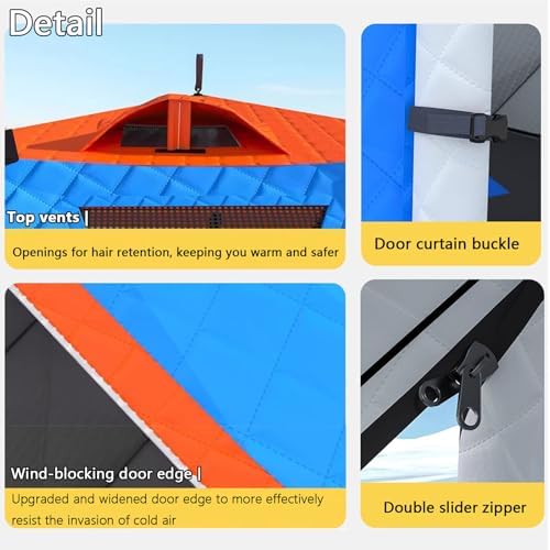 Experience the thrill of ice fishing with our premium pop-up ice fishing tent, designed for those who crave adventure even in winter's cold embrace. This winter fishing tent is your perfect companion for creating memorable fishing experiences with family and friends, accommodating 6-10 people comfortably. Crafted from durable 420D fabric, this tent ensures excellent insulation with its hollow cotton filling and 210D Oxford lining, keeping you warm while you focus on reeling in that big catch. The tent’s impressive dimensions, with a diagonal inner diameter of approximately 260cm and a height of about 170cm, provide ample space to move around, making your fishing trip enjoyable. Setup is a breeze—simply pop it open in seconds and enjoy features like two doors for easy access, multiple ventilation holes for airflow, and chimney holes for your firewood heater, enhancing your comfort while fishing. The tent's 4.4 square meters of usable area allows you to store your gear and relax while waiting for a bite. When it's time to pack up, the tent conveniently folds down to a compact size of approximately 100*28*28cm, weighing only 16.5kg, making transport effortless with the included portable storage bag. Our package includes everything you need for a successful outing: a fully insulated ice fishing tent, a winter fishing mat, ice spikes for stability, windproof ropes, and a handy storage bag. If you have any questions or need assistance, our dedicated team is here to help you make the most of your ice fishing adventures. Enjoy the great outdoors in comfort and style with our pop-up ice fishing tent!
