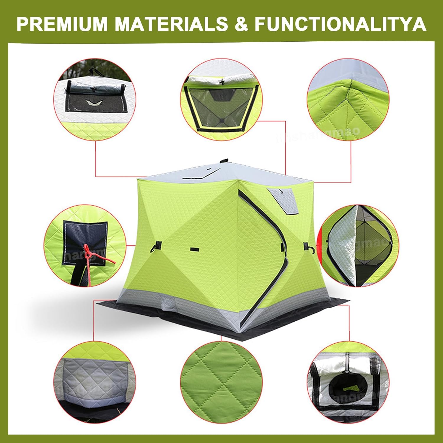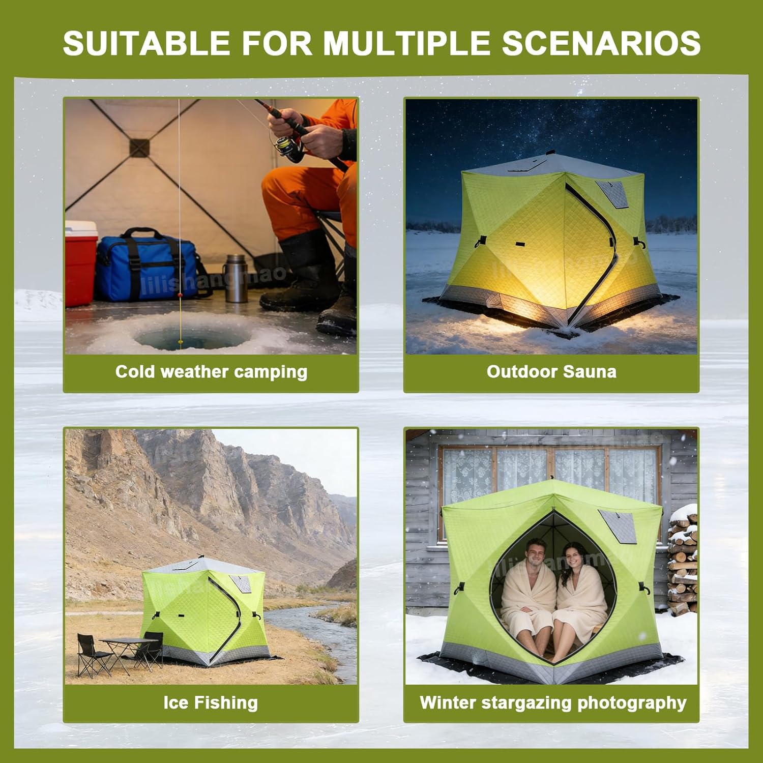 This is not merely a tent, but a specially designed mobile shelter crafted for ice and snow. Combining triple-layered thermal insulation with windproof design and rapid deployment, it offers robust protection, expansive views, and a dedicated stove chimney opening. Whether for ice fishing, outdoor sauna sessions, or year-round camping, its professional-grade performance redefines comfort and freedom in frigid environments.❒ Features : 3-layer insulating fabric delivers robust thermal insulation performance. A zip-up door and triple-Layer Adjustable Window, offering expansive views and excellent ventilation. 1.8x1.8x1.7 m outdoor tent accommodating 2-3 persons for ice fishing or sauna sessions. Effortlessly folds or unfolds for convenient daily storage or portability.❒ Specifications:Name: Outdoor Ice Fishing TentExpanded Dimensions: 180 x 180 x 175 cmFolded Dimensions: 130 x 26 x 26 cmSupport Pole: 9.5 mm fiberglass poleBottom heating pipe outlet: YesChimney vent: YesZip door: YesIce fishing mat: YesCapacity: 2-3 peopleWeight: 9.6 kg❒ Package Contents:Main Tent * 1Ice Fishing Mat * 1Portable Storage Bag * 1Ground Pegs * 4Gale Lines * 4Friendly reminder : If you have any questions about our Outdoor Ice Fishing Tent, please contact us via Amazon email, and we will be happy to assist you.