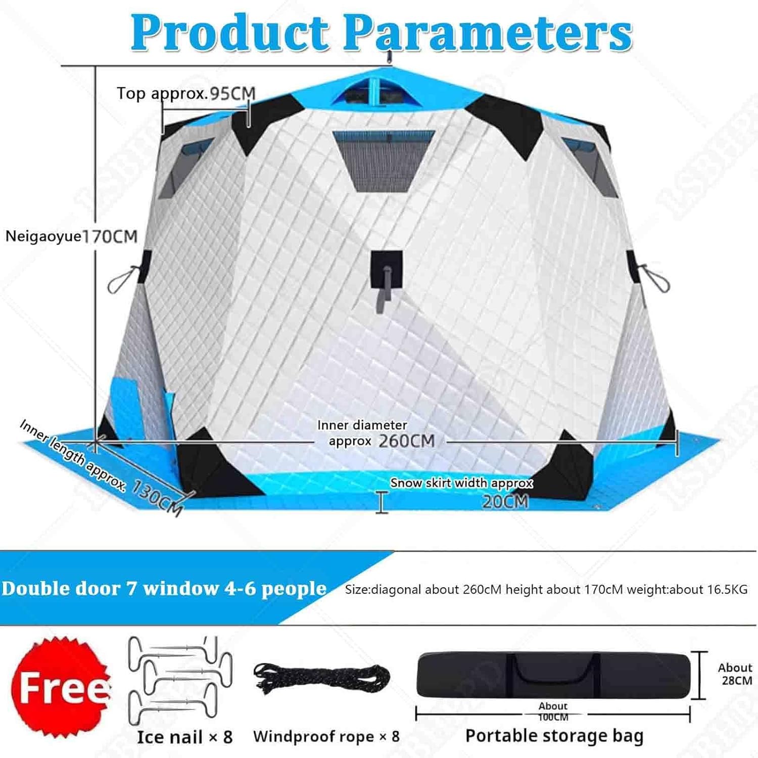 (◕ᴗ◕✿) Welcome to our shop!!!Want to enjoy the warmth of spring fishing amidst the snow and ice?Your ice fishing gear shouldn't be complete without this pop-up ice fishing tent that opens in a second✪ Specifications:● Name: Winter Fishing Tent / Pop-up Ice Fishing Tent / Ice House● Fabric: 420D Oxford Cloth● Filling: Hollow Cotton 220g/m²● Lining: 210D Oxford Cloth● Support Rods: 11mm● Accommodates approximately 3-5 people● Tent Inner Diameter: Approximately 260cm diagonally● Tent Height: Approximately 170cm inside height● Usable Area: Approximately 4.4 square meters● Storage Dimensions: Approximately 100*28*28cm● Weight (including packaging): Approximately 16.5kg● Doors * 2 - Windows * 7 - Ventilation holes * 2 - Chimney holes * 1 - Firewood heater holes * 2✪ Package includes:Fully insulated ice fishing tent × 1Ice spikes × 6Windproof ropes × 6Portable storage bag × 1✪ If you have any questions or need advice, please don't hesitate to contact us. We will get back to you as soon as possible and provide you with a quality solution.