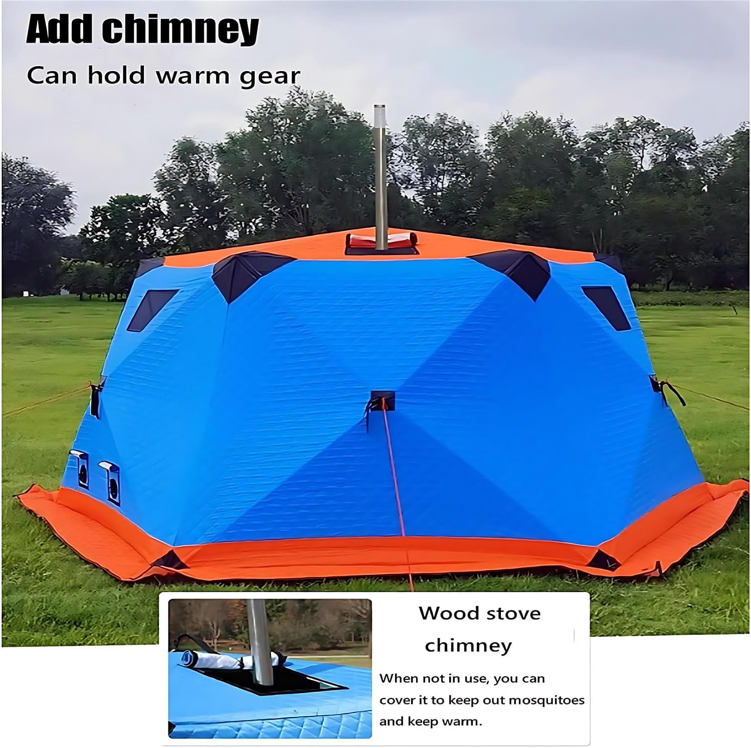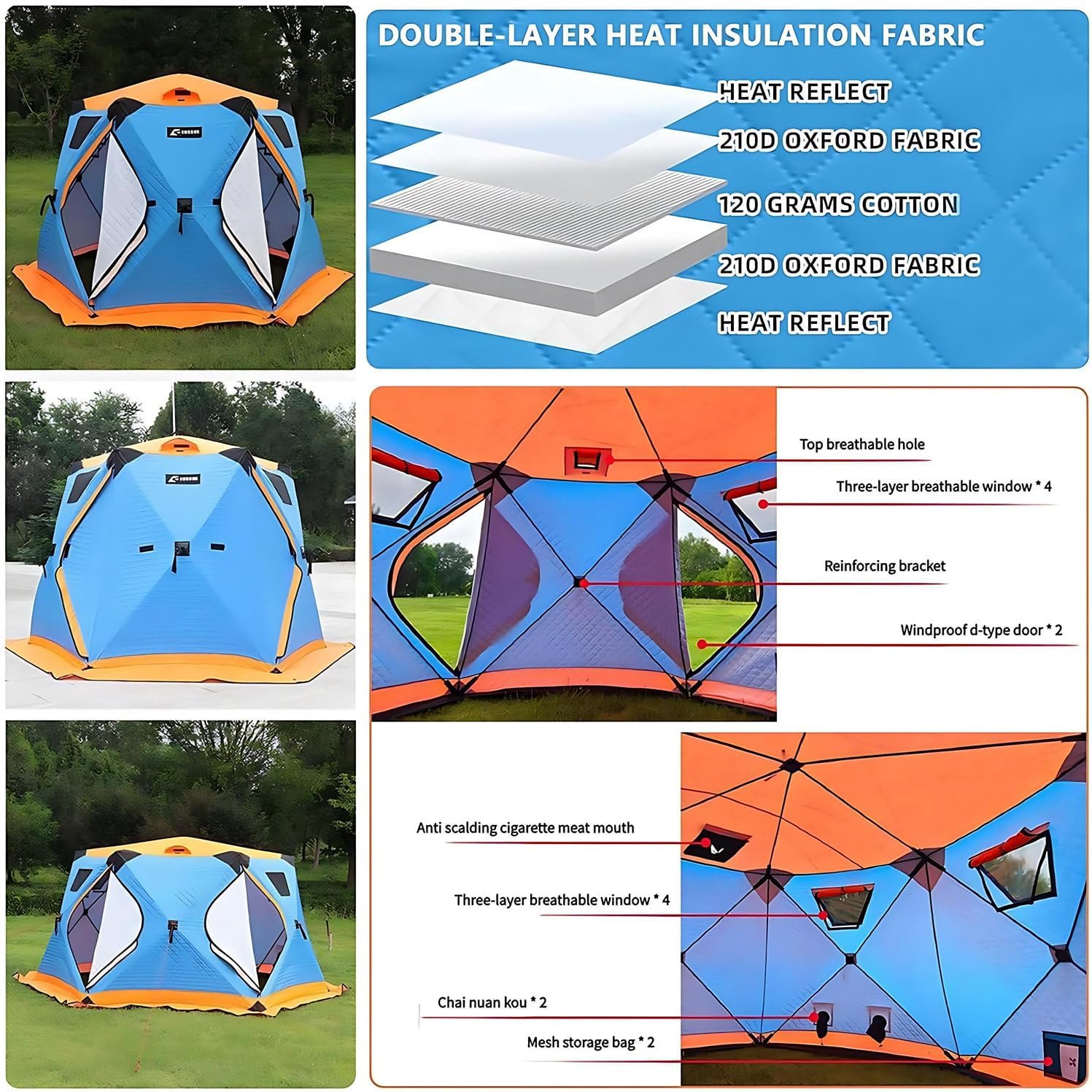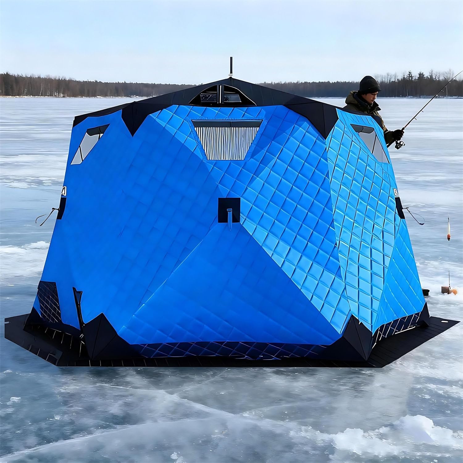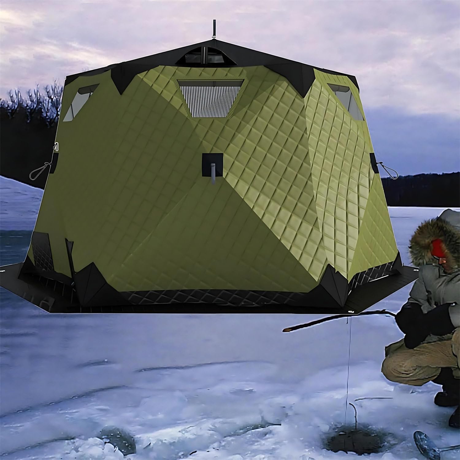 Experience the warmth of spring fishing even amidst the snow and ice with our pop-up ice fishing tent. Your ice fishing gear is not complete without this quick-opening tent that sets up in seconds.Specifications:- Name: Winter Fishing Tent / Pop-up Ice Fishing Tent- Fabric: 420D Cloth- Filling: Hollow Cotton 220g/m²- Lining: 210D Oxford Cloth- Support Rods: 11mm- Accommodates approximately 6-10 people- Tent Inner Diameter: Approximately 260cm diagonally- Tent Height: Approximately 170cm inside height- Usable Area: Approximately 4.4 square meters- Storage Dimensions: Approximately 100*28*28cm- Weight (including packaging): Approximately 16.5kg- Features: 2 Doors, 7 Windows, 2 Ventilation Holes, 1 Chimney Hole, 2 Firewood Heater HolesPackage includes:- 1 Fully insulated ice fishing tent- 1 Winter fishing mat- 6 Ice spikes- 6 Windproof ropes- 1 Portable storage bagFor any questions or advice, please feel to contact us. We will respond promptly and provide you with a quality solution.