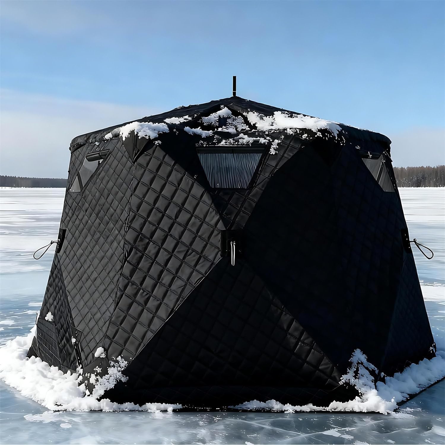 Experience the warmth of spring fishing even amidst the snow and ice with our pop-up ice fishing tent. Your ice fishing gear is not complete without this quick-opening tent that sets up in seconds.Specifications:- Name: Winter Fishing Tent / Pop-up Ice Fishing Tent- Fabric: 420D Cloth- Filling: Hollow Cotton 220g/m²- Lining: 210D Oxford Cloth- Support Rods: 11mm- Accommodates approximately 6-10 people- Tent Inner Diameter: Approximately 260cm diagonally- Tent Height: Approximately 170cm inside height- Usable Area: Approximately 4.4 square meters- Storage Dimensions: Approximately 100*28*28cm- Weight (including packaging): Approximately 16.5kg- Features: 2 Doors, 7 Windows, 2 Ventilation Holes, 1 Chimney Hole, 2 Firewood Heater HolesPackage includes:- 1 Fully insulated ice fishing tent- 1 Winter fishing mat- 6 Ice spikes- 6 Windproof ropes- 1 Portable storage bagFor any questions or advice, please feel to contact us. We will respond promptly and provide you with a quality solution.