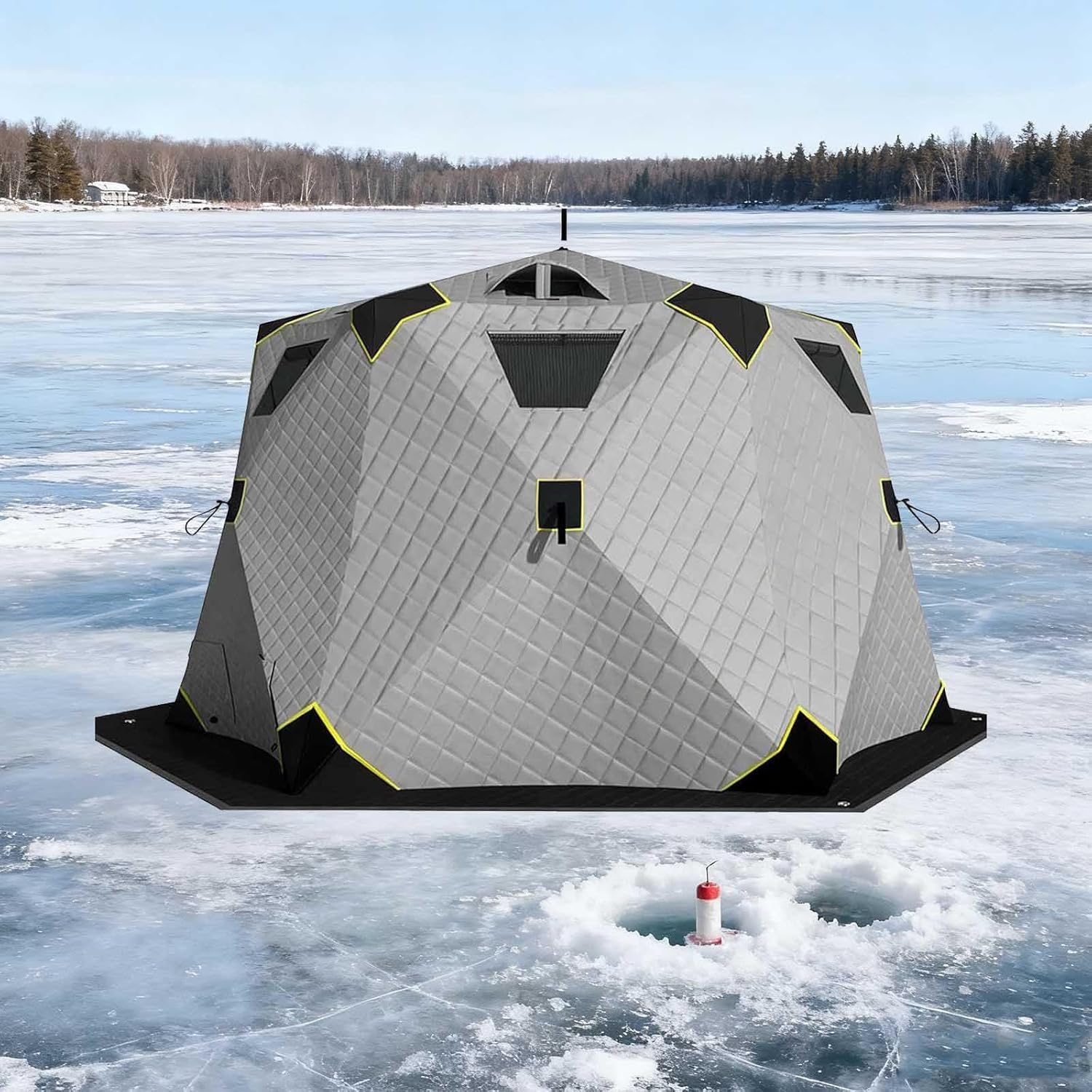 ◆ Tired of shivering on the ice?◆ Is the space inside an ice fishing tent big enough? Will it be cramped for several people?◆ If the tent isn't windproof and snowproof, even the most enthusiastic spirit will be dampened by the cold, won't it?◆ A spacious hexagonal tent is your warm haven, accommodating 6-10 people and maintaining warmth and stability even in temperatures as low as -30°C (-22°F).◆ Product Specifications:Product Name: Winter Fishing Tent / Quick-Setup Ice Fishing Tent / IglooFabric: 420D FabricFilling: 220 g/m² Hollow Core CottonLining: 210D Oxford ClothSupport Pole: 11 mmCapacity: Approx. 6-10 peopleTent Inner Dimensions: Approx. 380 cm (diagonal)Tent Height: Approx. 180 cm (internal height)Usable Area: Approx. 7.2 m²Folded Dimensions: Approx. 130 x 32 x 32 cmWeight (including packaging): Approx. 22 kgLarge Hexagonal Design: 2 doors / 5 windows / 2 ventilation holes / 1 chimney opening / 2 firewood heating openings / 2 fishing openings◆ Note: ♦ Choose a location with thick, solid ice – avoid crevasses and floating ice.♦ Set up the tent securely; firmly secure the guy lines and tent pegs to prevent the tent from collapsing or being blown away by the wind.♦ Exercise caution when inside the tent—avoid sharp objects that could puncture it.♦ After use: Thoroughly remove any debris/snow from inside the tent.◆ Product Package:1 * Fully Insulated Ice Fishing Tent1 * Winter Fishing Mat6 * Ice Pegs6 * Guy Lines1 * Portable Packing Bag(Two packages shipped)◆ Customer service:If you have any questions about our products, please feel to contact us and we will reply to you within 24 hours.