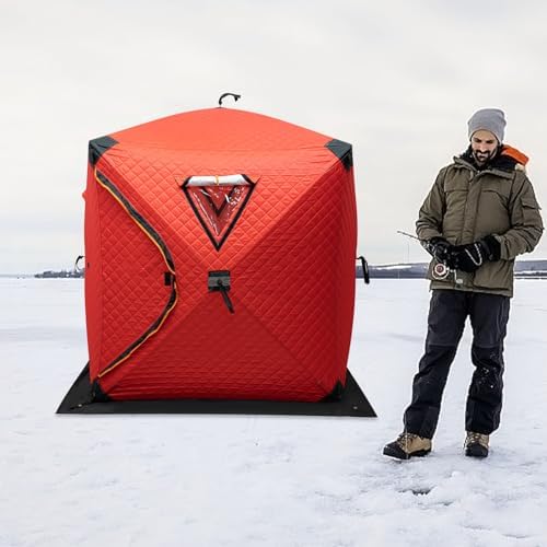 Enhance your ice fishing experience with our outdoor ice fishing tent! Constructed from durable fiberglass rods and robust 210D Oxford cloth, this tent features three layers of cotton insulation, ensuring you stay warm and protected from the elements. Its spacious design comfortably accommodates you and your fishing companions, creating a cozy environment for your ice fishing adventures. The tent is designed with a convenient door and two windows, allowing you to easily observe fish activity on the ice and boosting your chances of a successful catch.Specifications:- Material: 210D Oxford Cloth, Fiberglass- Color: Red- Shape: Square- Seasons: Winter- Sport: Fishing- Closure Type: Zipper- Mounting Type: Freestanding- Assembly Required: Yes- Care Instructions: Hand-wash- Capacity: 1-2 People- Gross Weight: 9.3 kg/20.5 lbs- Net Weight: 9 kg/19.84 lbs- Fiberglass Rod Diameter: 9.5 mm/0.37 in- Expanded Product Size: 145 x 145 x 165 cm / 57.09 x 57.09 x 64.96 in- Package Size: 24 x 24 x 110 cm / 9.45 x 9.45 x 43.31 inPackage Includes:- 1 Ice Fishing Tent- 4 Ice Anchors- 1 Bundle of Windproof Ropes- 1 Toolbag- 1 HandbagNotes:1. When using this tent, please adhere to local regulations and practice responsible camping to minimize environmental impact.2. This product does not come with a backing cloth, and the bottom is not waterproof. It is not flame retardant, so keep it away from fire sources while in use.3. Hand-wash only; machine washing is not recommended.4. Please allow for slight color variations due to lighting and a 1-3 cm margin of error in measurements. Ensure you are comfortable with these details before ordering.