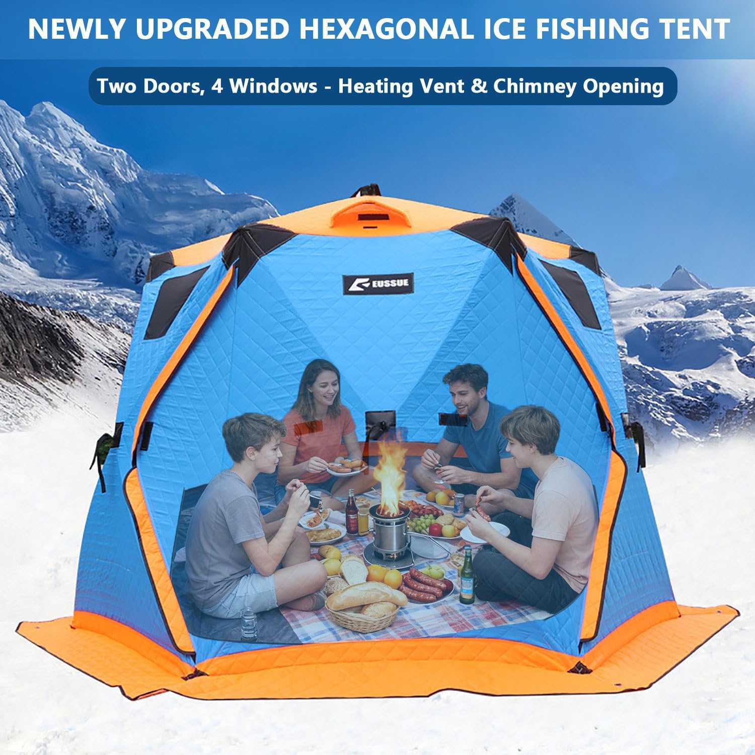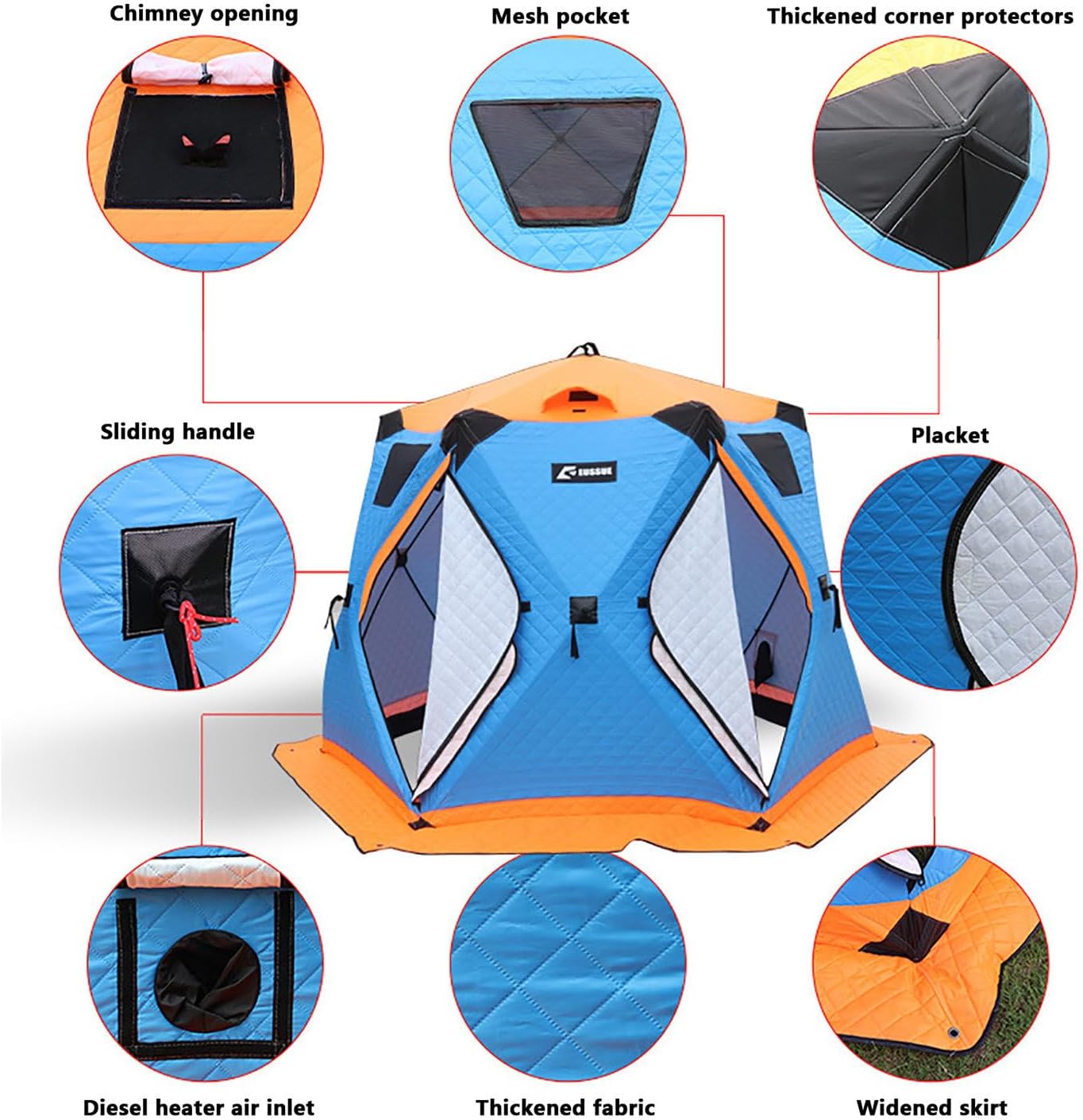 Product DescriptionExperience comfort, warmth, and reliability on the ice with this upgraded insulated ice fishing tent, designed for anglers, campers, and winter explorers. Available in three large-size options, it comfortably accommodates 6–12 people, making it ideal for group fishing trips or multi-day outdoor stays.⭐Large-Capacity Ice Fishing Shelter✅Height 175–180cm, allowing easy movement inside the tent✅Supports installation of a wood-burning stove (stove jack) for heating⭐Dual-Layer 210D Oxford + 120g Insulation – Built for Extreme Winter✅Outer layer: 210D Oxford✅Middle layer: 120g Insulation enhances warmth✅Inner layer: Flame-retardant treatment for enhanced safety✅Frame: 9.5mm/11mm fiberglass rod (lightweight yet high strength)⭐Stove-Ready Design with High-Temperature Chimney Port✅4 TPU View Windows✅2 Ventilation Openings: Maintain air circulation✅2 Large Two-Way Zipper Doors: Allows for multiple people✅Internal Storage Pockets: For storing fishing gear, power supplies, etc.⭐Quick Pop-Up Setup & Portable All-in-One Kit✅500°C High-Temperature Aramid Chimney Opening✅2 Bottom Warm Air Inlets (can be connected to hot air blowers)✅6 Ice Anchors + 6 Windproof Ropes for Stability⭐Product ParametersModel: 2617 Small Hexagonal Tent (6-8 persons)Expanded Dimensions (excluding skirt): 260*260*175cmFolded Dimensions: 28*34*106cmNet Weight: 11.3kg, Gross Weight: 12.4kgModel: 3318 Large Hexagonal Tent (8-10 people)Expanded Dimensions: 330*330*180cmFolded Dimensions: 148*30*30cmNet Weight: 15.25KG, Gross Weight: 16.85KGModel: 3518 Large Hexagonal Tent (8-12 people)Expanded Dimensions (excluding skirt): 350*350*180cmFolded Dimensions: 32*45*150cmNet Weight: 15.8KG, Gross Weight: 17.2KG