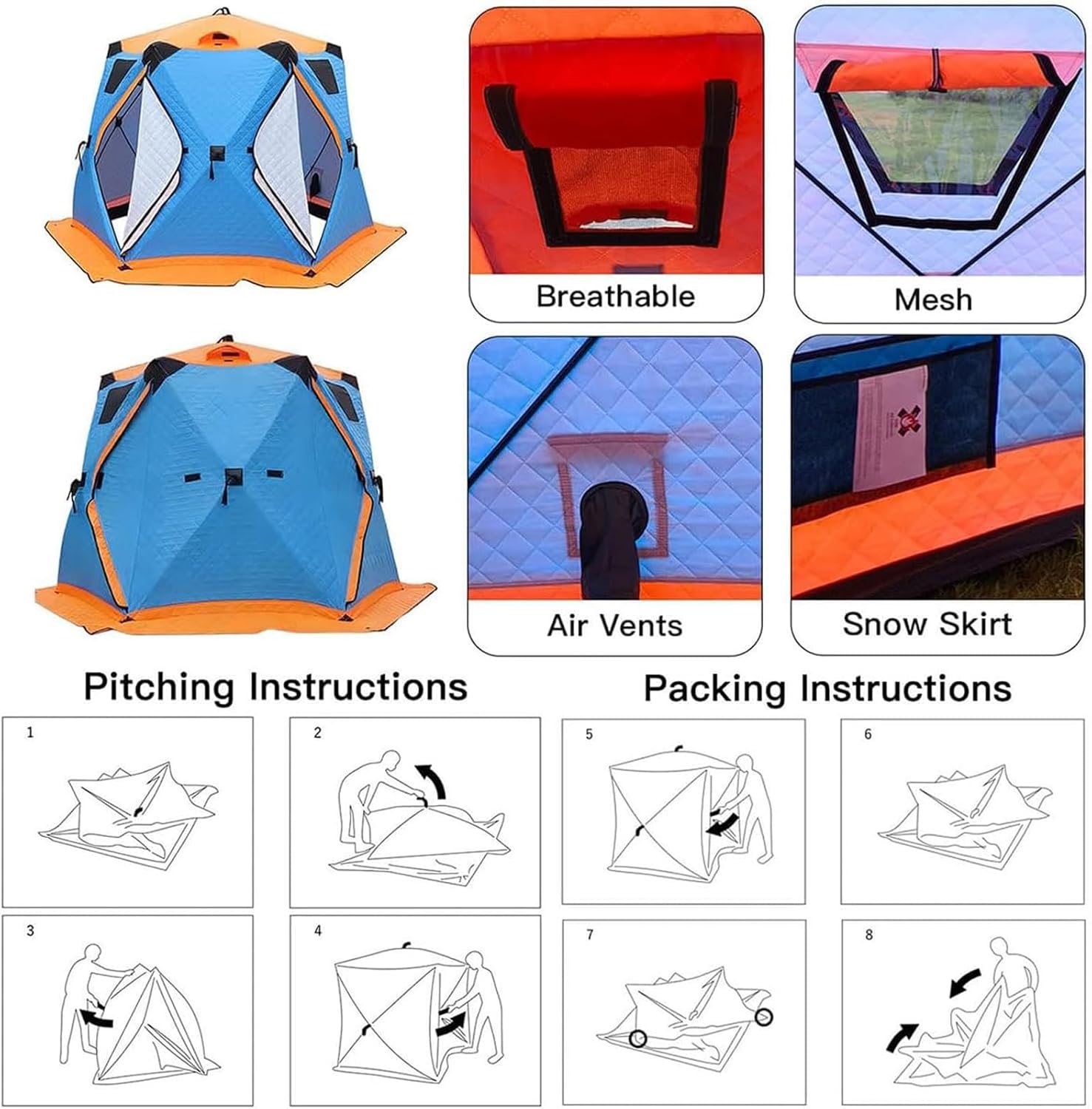 Insulated Ice Fishing Tent, Waterproof, Portable Pop-Up Ice Fishing Tent with 2 Doors and Storage Bag, Oxford FabricFeatures:Fully automatic setup of the ice fishing tent. Product Specifications:2.6 x 2.6 x 1.75 m / 12 kg (for 6–8 people)Description:Name: Ice Fishing TentMaterial: Oxford fabricFilling: Quilted cottonLiner: Tear-resistant 600D Oxford fabricFrame Material: FiberglassWeight (including packaging): Approx. 16 kgAssembled Size: 2.6 / 3.3 / 3.6 metersPacked Size: Approx. 150 x 30 x 32 cmIncluded:Ice Anchors * 6Guy Lines * 6Storage Bag * 1