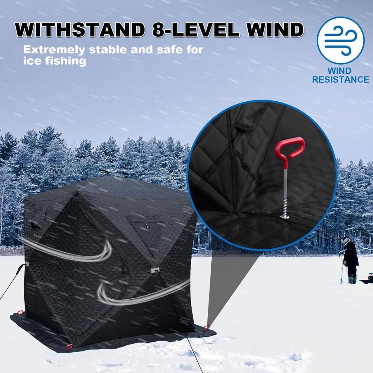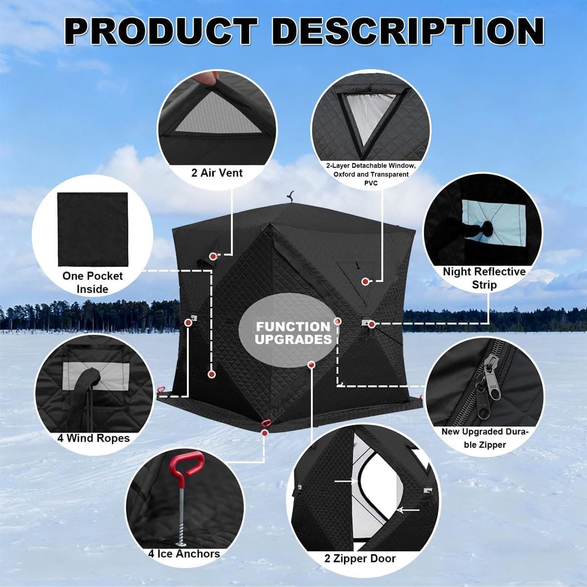Experience the ultimate outdoor luxury with this multi-functional sauna and ice fishing tent. This product serves as a year-round outdoor retreat, perfect for enjoying a steaming sauna in winter or setting up a warm fishing spot on a lake. It combines quick setup, robust protection, panoramic views, and user-friendly design to enhance outdoor comfort and convenience.Specification:Name: Ice Fishing Sauna TentExpanded Dimensions: 180 x 180 x 210 cmFolded Dimensions: 130 x 26 x 24 cmSupport Pole: 9.5 mm fiberglass poleWindow: TPU clear glass with removable PVC window panelChimney: 44 x 34 cm with fire-resistant cotton edgingDoor Design: Double zipper doorCapacity: Recommended for 3-4 peoplePackage Included:1¡Á Main Tent1¡Á Portable Storage Bag4¡Á Ice Pegs/Ground Pegs4¡Á Gale LinesNotes:1. Please allow slight color differences due to shooting light and a 1-3 cm error from manual measurement.2. For any questions, contact us for a response within 24 hours.