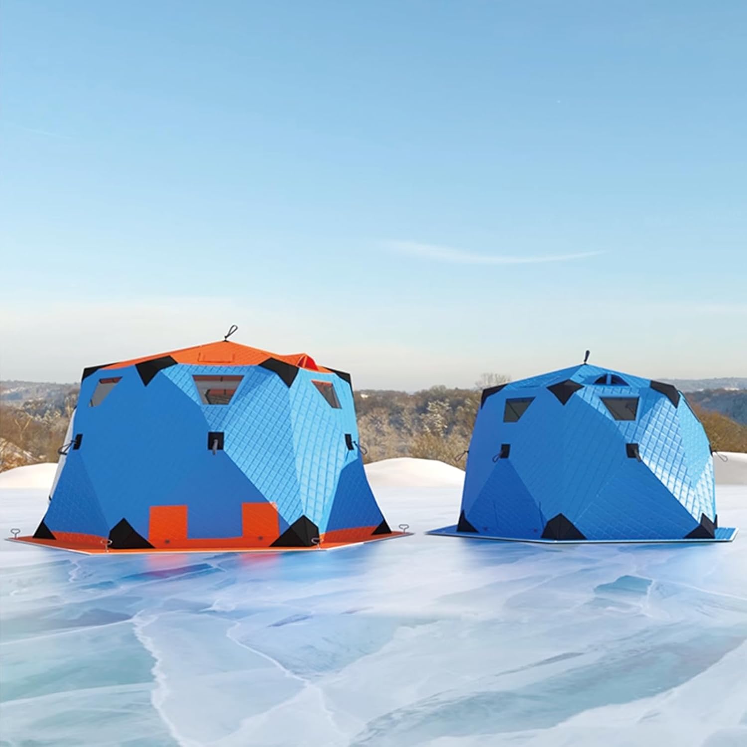 Pop Up Ice Fishing Shelter, Fully Insulated Ice Fishing Shelter, with Insulated Layer to Windproof and Warm Ice Fishing Tent, 2 doors, 7 windows, 2 ventilation holes, 1 chimney opening, 2 firewood heater openings Describe: Name: Winter fishing tent Surface fabric: 420D Oxford cloth Filling: hollow cotton 220g/㎡ Inner fabric: 210D Oxford cloth Support rod: 11mm Weight (including packaging): about 35kg Expanded dimensions: diagonal approximately 430cm; diagonal length approximately 400cm; inner height approximately 220cm Packing size: about 115*50*50cm Product List: 1* winter fishing tent 8* Ice nails 8* Windproof rope