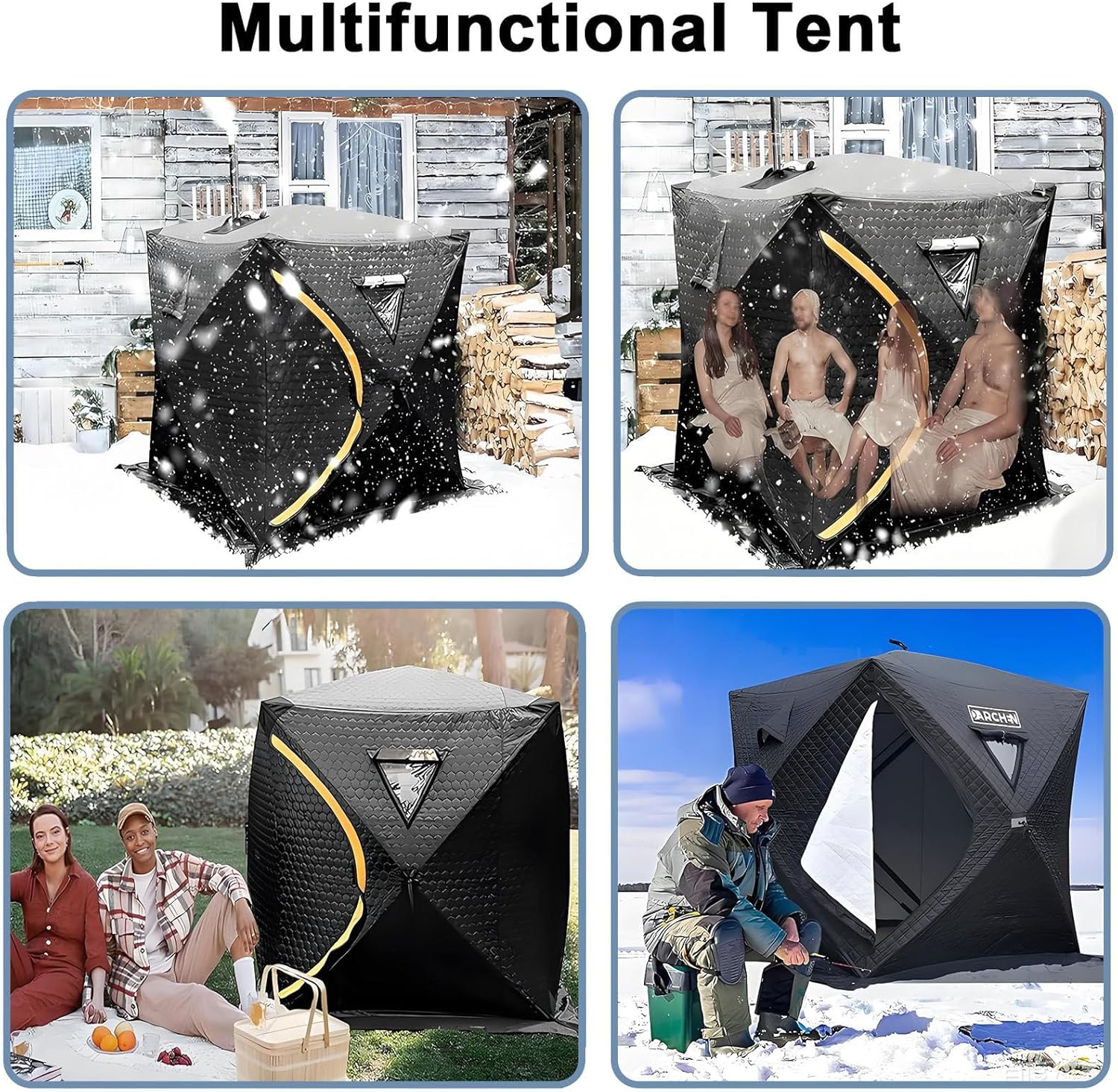 ▶Craving a cozy sauna in snow-covered wilderness or a warm private fishing spot on ice-locked lakes?This multi-functional sauna & ice fishing tent is more than a tent—it’s your year-round ideal outdoor retreat. It works as a portable sauna for warmth and relaxation, and a windproof, snowproof haven for ice fishing lovers to wait for catches calmly. Quick to set up, it also boasts unobstructed views for enjoying the outdoors while relaxing.▶Product Specifications:Name: Ice Fishing Sauna TentWindow: Transparent TPU glass + removable PVC window panelFireproof chimney: 18.5*11.5cmDoor: Double zipper (double door, double window)Material: 210D Oxford cloth◆1. Black - 1.8mDimensions (assembled): 210 x 180 x 180 cmDimensions (folded): 130 x 26 x 26 cmSupport pole: 9.5 mm fiberglassCapacity: Recommended for 3-4 peopleWeight: 13 kg/28.6 lbs◆2. Black - 2.1mDimensions (assembled): 220 x 210 x 210 cmDimensions (folded): 158 x 30 x 30 cmSupport pole: 9.5 mm fiberglassCapacity: Recommended for 4-5 peopleWeight: 15 kg/33 lbs◆3. Black Sauna - 1.8mDimensions (assembled): 210 x 180 x 180 cmDimensions (folded): 132 x 28 x 28 cmSupport pole: 11 mm fiberglassCapacity: Recommended for 3-4 people Weight: 14.5 kg / 31.9 lbsSupport fabric: 84 flame-retardant fabric◆4. Black Sauna - 2.1mDimensions (assembled): 220 x 210 x 210 cmDimensions (folded): 158 x 30 x 30 cmSupport poles: 11 mm fiberglassCapacity: Recommended for 4-5 peopleWeight: 17.4 kg / 38.3 lbsSupport fabric: 84 flame-retardant fabric▶Package contents:Main tent x 1Storage bag x 1Ice pegs/ground pegs x 4Drawstrings x 4Chimney x 1If you have any questions about the product, please email us immediately and we will respond as soon as possible.