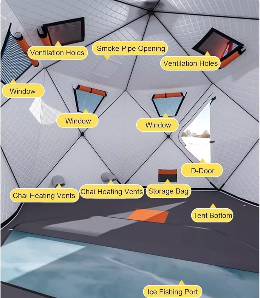 *Pop Up Ice Fishing Shelter, Ice House Ice Huts For Ice Fishing Fully Insulated Ice Fishing Shelter, With Insulated Layer To Windproof And Warm Ice Fishing Tent, 2 Doors, 7 Windows, 2 Ventilation Holes, 1 Chimney Opening, 2 Firewood Heater OpeningsDescribe:Name: Winter fishing tentSurface fabric: 420D Oxford clothFilling: hollow cotton 220g/㎡Inner fabric: 210D Oxford clothSupport rod: 11mmWeight (including packaging): about 35kgExpanded dimensions: diagonal approximately 430cm; diagonal length approximately 400cm; inner height approximately 220cmPacking size: about 115*50*50cmProduct List:1* fishing tents8* Ice nails8* Windproof rope