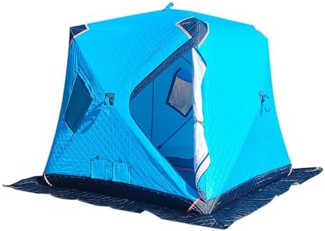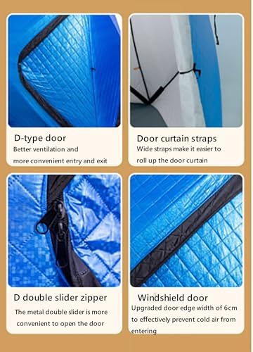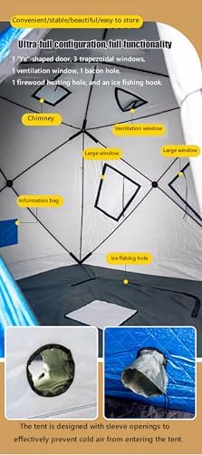 Safety Information This portable ice fishing shelter is built for diverse weather conditions. For stability in windy situations, securely anchor it to the ice using the included ice spikes and ropes. Regularly check and adjust the anchors as needed. Adhere to the maximum occupancy limit and be mindful of UV exposure and fire risks. Always follow the manufacturer’s guidelines for setup, use, and takedown. Description: Name: Winter fishing tent Surface fabric: Oxford cloth Filling: Hollow cotton (220g/㎡) Inner fabric: Oxford cloth Support rod: 11mm Weight (including packaging): Approximately 13kg Expanded dimensions: 230*230*170cm Packed size: Approximately 140*35*35cm Product List: Storage bag × 1, ice nails × 4, windproof rope × 4, transparent window × 3, chimney × 1