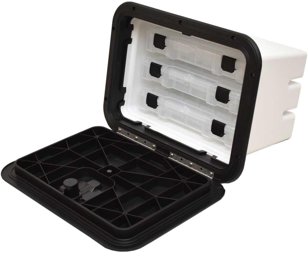 Boat part number 1094458 is a new tackle center from Innovative Product Solutions , part number 530-109 .This tackle center is constructed from black colored marine grade plastic with a textured finish on the face. Features lift and twist latch. Includes (3) tackle boxes. Mounts via (11) 3/16" Dia. mounting holes set around the perimeter.Approximate Measurements: Overall: 15" W x 11" H x 9 3/8" DCutout: 13 1/4" W x 9 1/4" H Specifications: Part Manufacturer: Innovative Product SolutionsPart Number: 530-109Model: M-1115-TC/BLKMaterial: Marine PlasticColor: Black / WhiteFinish: TexturedMounts: (11) 3/16" Mounting Holes Sold as seen in pictures. Customers please note every computer shows colors differently. All measurements are approximate.Hardware and instruction / installation manual not included.