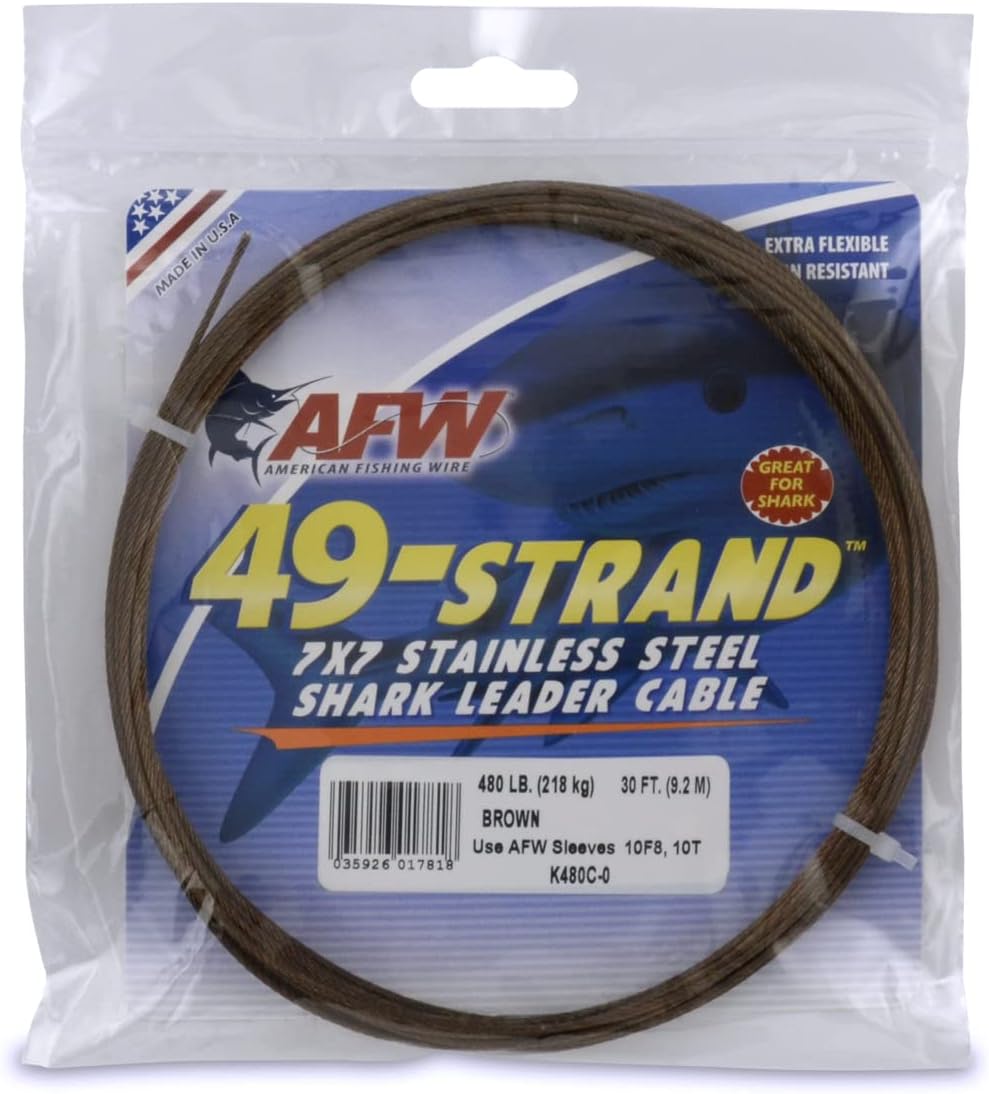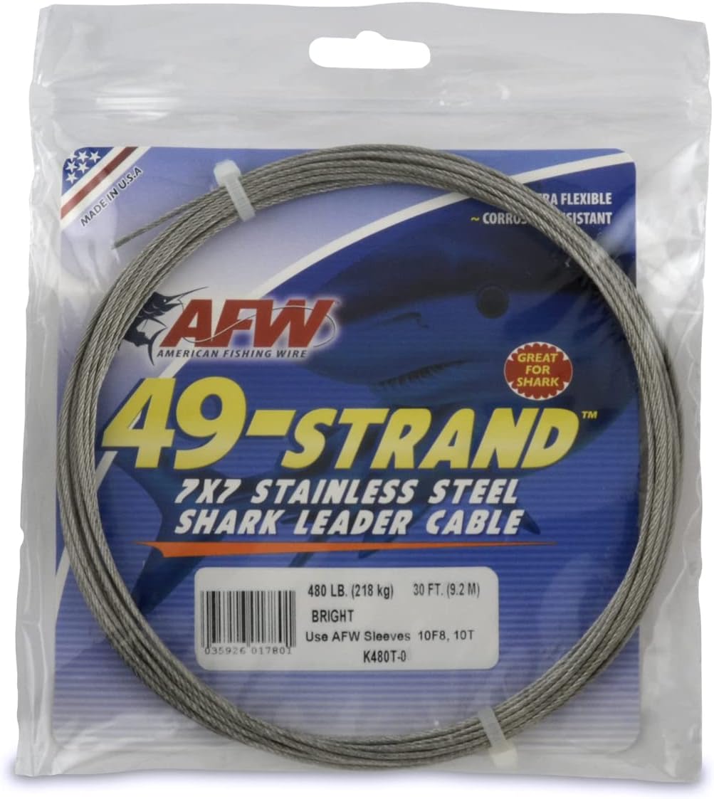 Made from high strength, corrosion resistant Type 304 stainless steel, 49 Strand 7x7 cable provides excellent kink resistance and bit protection against shark and other big game toothy fish. This motion can kink single strand leader wire and can actually be more destructive to your tackle than the fierce bite. 49-Strand resists kinking, wrestles back, and allows you to hook up and haul in. This leader is designed for the hard hitting big game species like tuna, sharks or barracuda in salt water conditions. If you have ever had your line cut with a light duty leader by ferocious teeth of sharks, tuna or barracuda, you know how important it is to have a quality leader that can take abuse and not break down. Made in the USA by AFW.