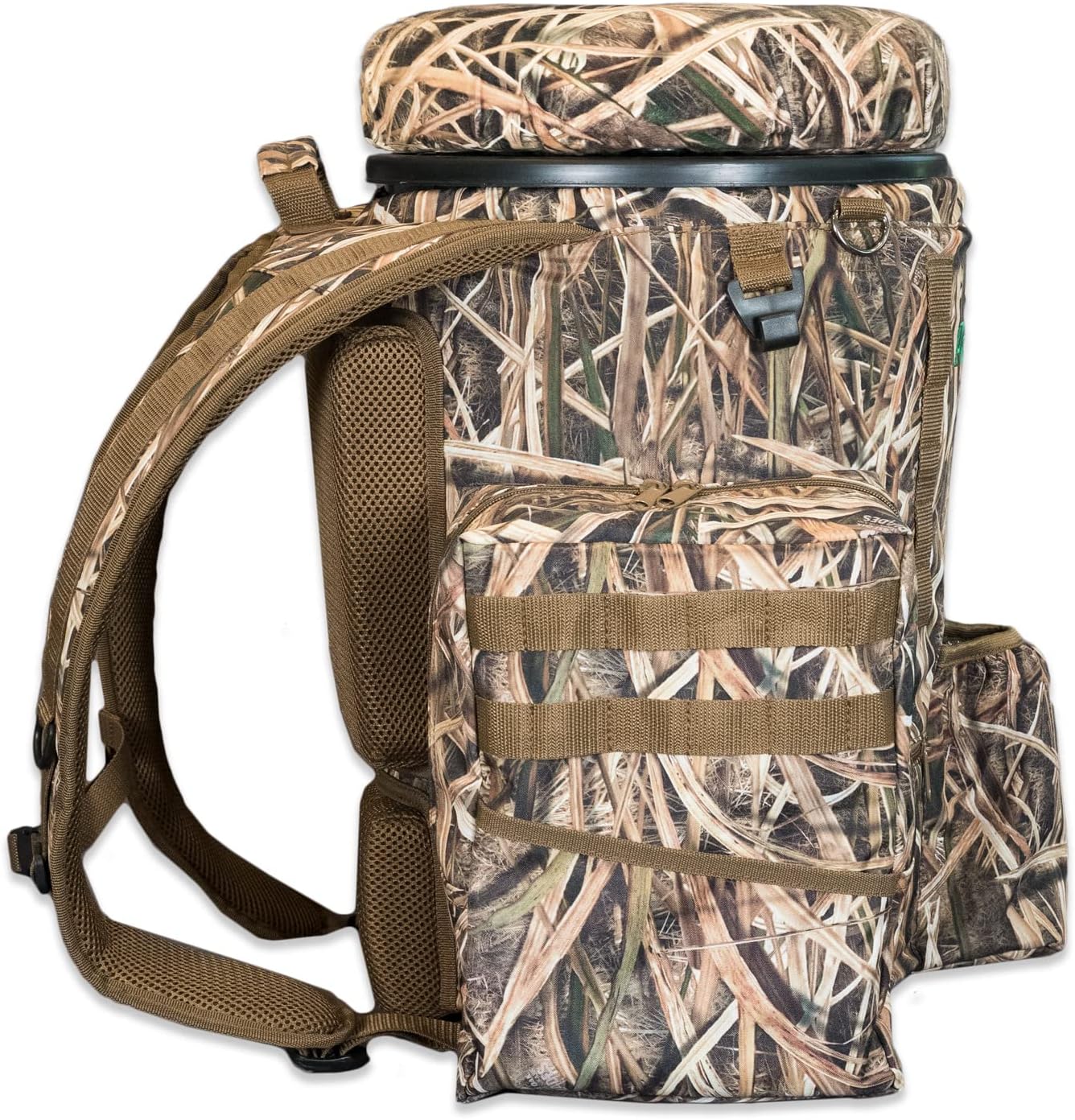 Introducing the new Venture Bucket Pack Pro. This pack has all the features a fisherman or hunter would ever want, including integrated, adjustable rod holders and side pockets big enough to hold two tackle boxes each. The new dual integrated rod holders are comprised of receiver pouches that stow away in zippered pockets when not in use. The receiver is paired with an adjustable "hook and loop" restraint on a vertical molle strap allowing it to be positioned at whatever height works best for your rod. If fishing is your specialty, we offer the optional Plano 3600 Prolatch StowAway tackle boxes as an add-on to fit perfectly in the backpack's side pockets. Store all your tackle in these boxes and easily slide two into each side pocket on your bucket pack. If this wasn't enough, we also increased the height of the pack by 4 inches creating a comfortable sitting height of 20". The Venture Bucket Pack Pro comes standard with a 6-gallon bucket and our new ultra thick XL Silent Spinning Seat cushion lid. Just like our regular Silent Spin Seat cushion lid, the XL version features nylon hardware and has no metallic ball bearings that will rust or make unnecessary noise. This seat cushion lid is also Made in the USA! To top it all off, we listened to our customers' feedback and upgraded several other features including the thicker shoulder straps, back pads and padded carry handle. We also added a new padded "dump" handle at the bottom of the pack to make it easy to empty out liquid, ice and other items.