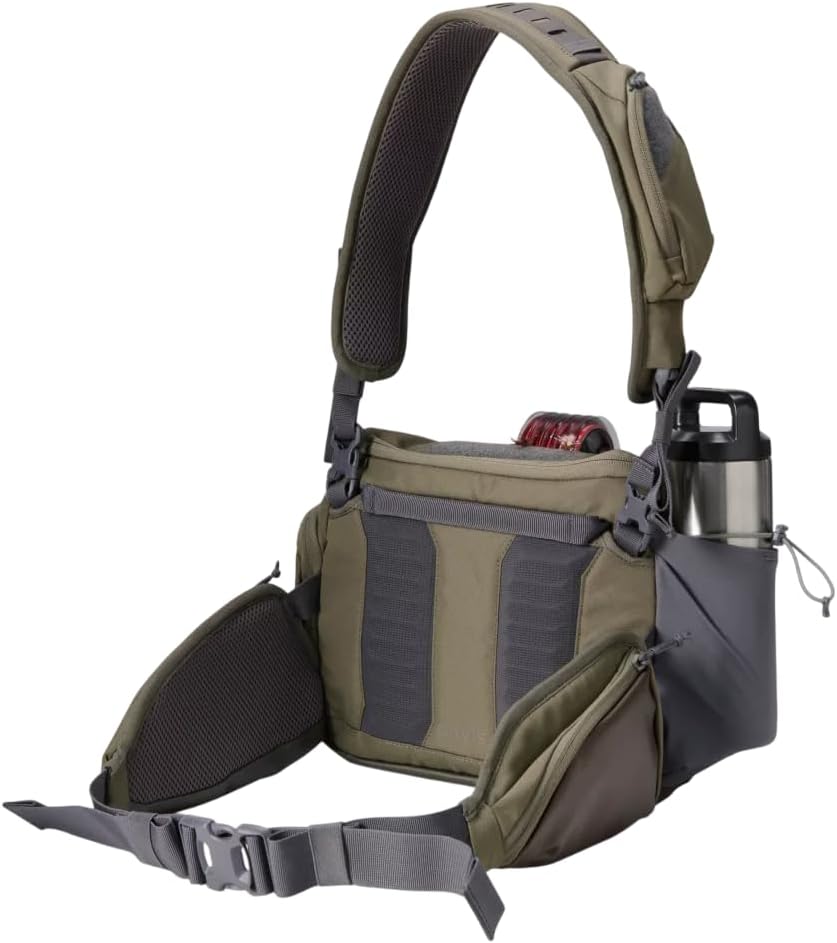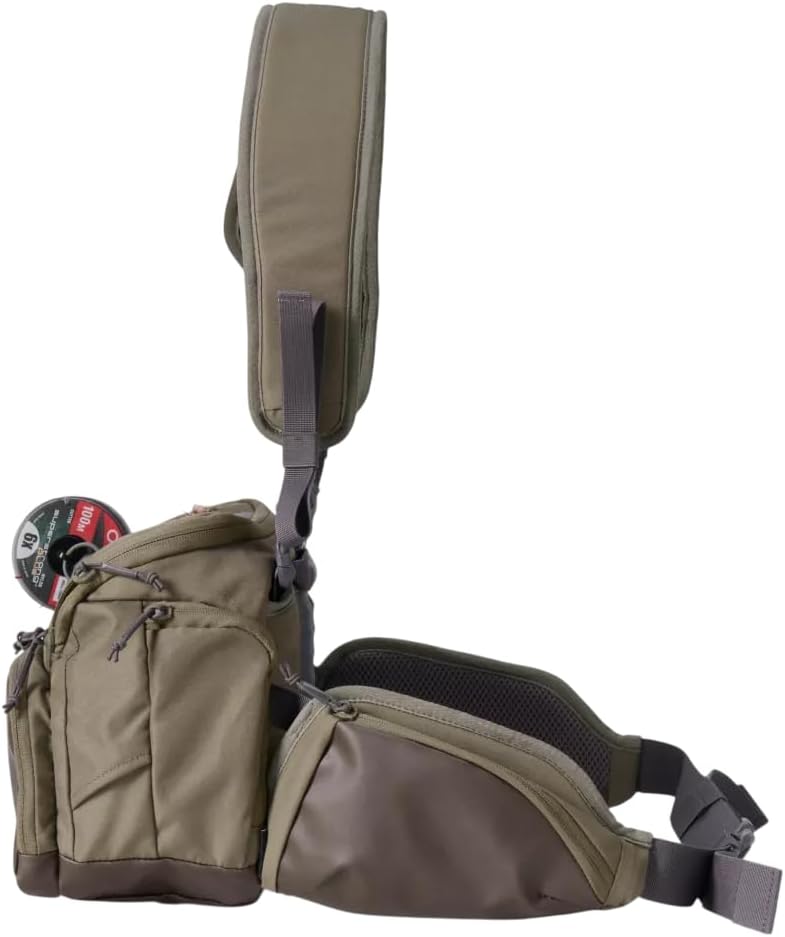 For those who love an unencumbered feel while fly fishing, whether a guide or hardcore angler, the Orvis Guide Hip Pack offers 9 liters of capacity and a highly innovative design to please any organizational perfectionist. The 100% recycled ECO CORDURA Guide Hip Pack has the new Patented Tippet Whippet recessed docking station with tippet bar included for instant, fixed, and fumble-free access for up to six spools. The large main compartment is topped with a large fly patch, and inside are a zip pocket, drop-in pockets, and stretch mesh sorting pockets. Smaller front compartment with mesh pockets. The substantial side panels both have zip pockets and hidden net scabbards that store a net with instant access. A lo-pro zinger/nipper pass-through port and small zip pocket on one side and a water bottle holder on the other. Included are two straps, one lightweight neck strap and one heavier shoulder strap with multiple docking stations, a zip pocket, and fly patch.