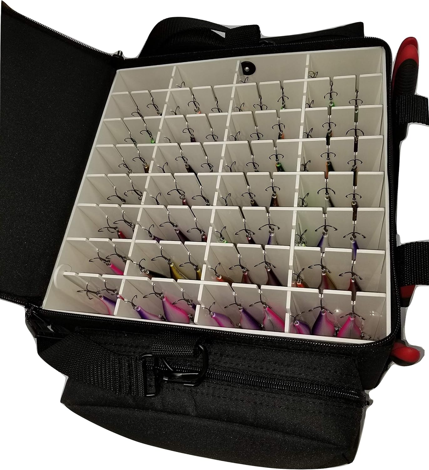 Tackle Box for Walleye/Bass NOW WITH MESH BOTTOM to allow air flow for drying and to keep baits from rusting Lure Saver hook slots (Patent Pending) to protect lures from loss or damage 7 removable/adjustable dividers Perfect for hanging bandits, crankbaits, spoons, and stickbaits. Some lures that will fit are Rattling Squarebills, Lipless Crankbaits, #9 and #11 Flicker Minnows, Deep Walleye Bandits, Deep Husky Jerks, Deep Rattlin’ Rogues, #14 Rapala Husky, Mann’s 20+ and Poe’s 400, Smithwick Perfect 10 and many more. Please refer to the dimensions of the case to make sure your lure will fit. Hangs from rear treble hook 2 zippered side pockets Heavy duty webbing handles and adjustable shoulder strap 2 ballistic front tool storage pockets Bait retrieval hook included Outside Case Dimensions: 12.75” L x 12.75” W X 8.5” H (not including pockets - 8" lure hanging storage) It is important to understand the measurements of Lakewood cases. Due to so many options out there on lures and hooks you need to be sure to measure the full length of your lures, end to end, when determining whether your lures will fit into a particular case. *Please note any accessories/objects used in photos DO NOT come with the case*