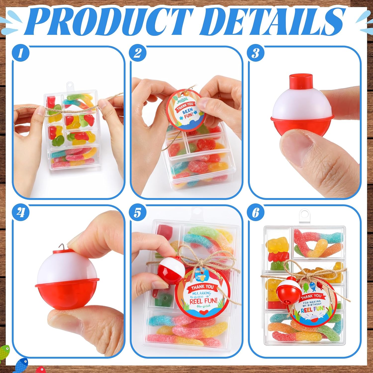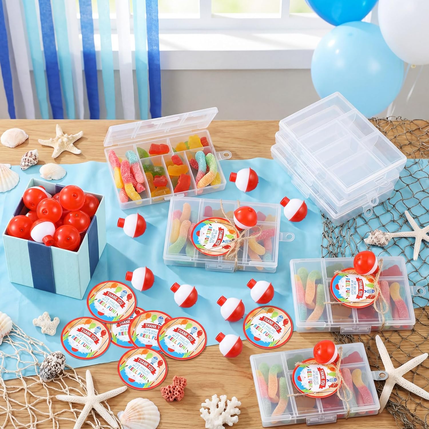 • Ample Quantity: our fishing birthday party decorations includes 36 small candy tackle boxes, 36 red and white floats, and 36 thank you cards; A wooden tabletop and a roll of twine are also included; The ample quantity is ideal for your party needs