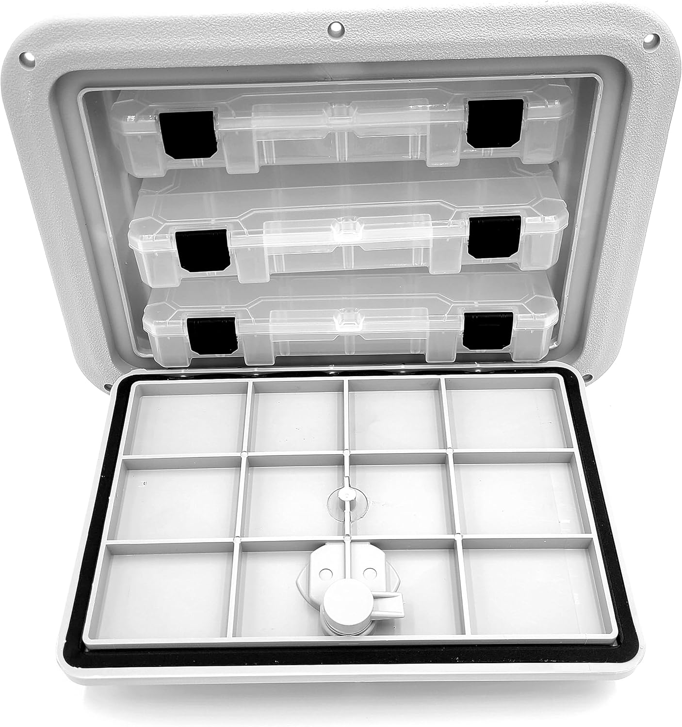 Our "Tackle Center" is the perfect storage solution for your fishing lures or first-aid kit. This storage center houses 3 storage trays (included) that conveniently slide in and out of the storage tub. The reinforced ribs on the lid make it capable of being stood or walked on for long periods of time. This is our lowest profile hatch that minimizes the chance of it being a tripping hazard as well if mounted in a high traffic area. The improved gasketing system provides a watertight seal that will keep everything underneath it dry. This product holds up to the harshest of weather conditions and is impervious to harsh chemicals. All of our products are UV stabilized minimizing degradation from prolonged sunlight exposure. Our superior 316 stainless steel piano hinge system prevents any premature rusting due to saltwater. Superior materials for a superior product. Both the Flambeau T4007 & Plano 3600 Series (2365074) will fit into our DPTC1115 tackle centers