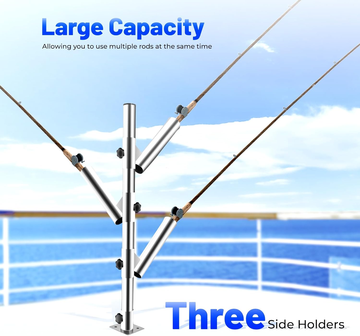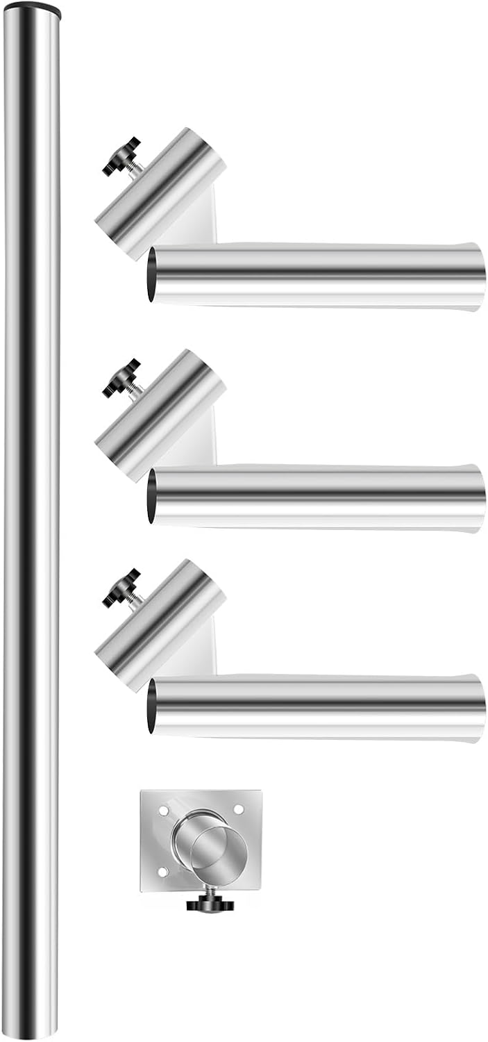 DescriptionThe vast sea is full of joy. A tree, a grass, a leaf, a lake, a person, a fish pole, let us experience the wonderful fishing life. How to fish easily on your boat or yacht? You need this triple clamping rod made of high-quality 316 stainless steel. It not only holds 1 to 3 rods at a time for more efficient fishing it also frees up your hands for easy fishing.DetailsProtective Cover: The protective plastic end cap for extra protection against normal wear and tear on your rod and reel.Hollow Rod Seat: The hollow rod seat is convenient to drain the water during fishing, reducing the maintenance and cleaning tasks.Non-slip Knobs: The enlarged non-slip knobs give you a comfortable touch, allowing you to adjust the tightness and position easily.Rubber Inserts: The rubber inserts can protect your fishing rod from any abrasion of the stainless steel surface and can reinforce the base to prevent it from moving.ApplicationThis product is suitable for fishing boats and yachts with pull rods. It is suitable for placing 1 to 3 fishing rods with a diameter of 4.2 cm/1.65 inch.SpecificationColor: SilverMaterial: 316 Stainless Steel, PlasticProcess: WeldingGross Weight: 3.85kg/8.5lbsInstallation Bracket Size: 7.5*5.5*0.3cm/3*2.2*0.11inProduct Height: 76cm/30inSingle Rod Size: 4.7*4.7*26cm/1.9*1.9*10.2inPackage Size: 77*32*12cm/30.3*12.6*4.7inPackage Included3*Side Rods1*Long Rod1*Rod Seat