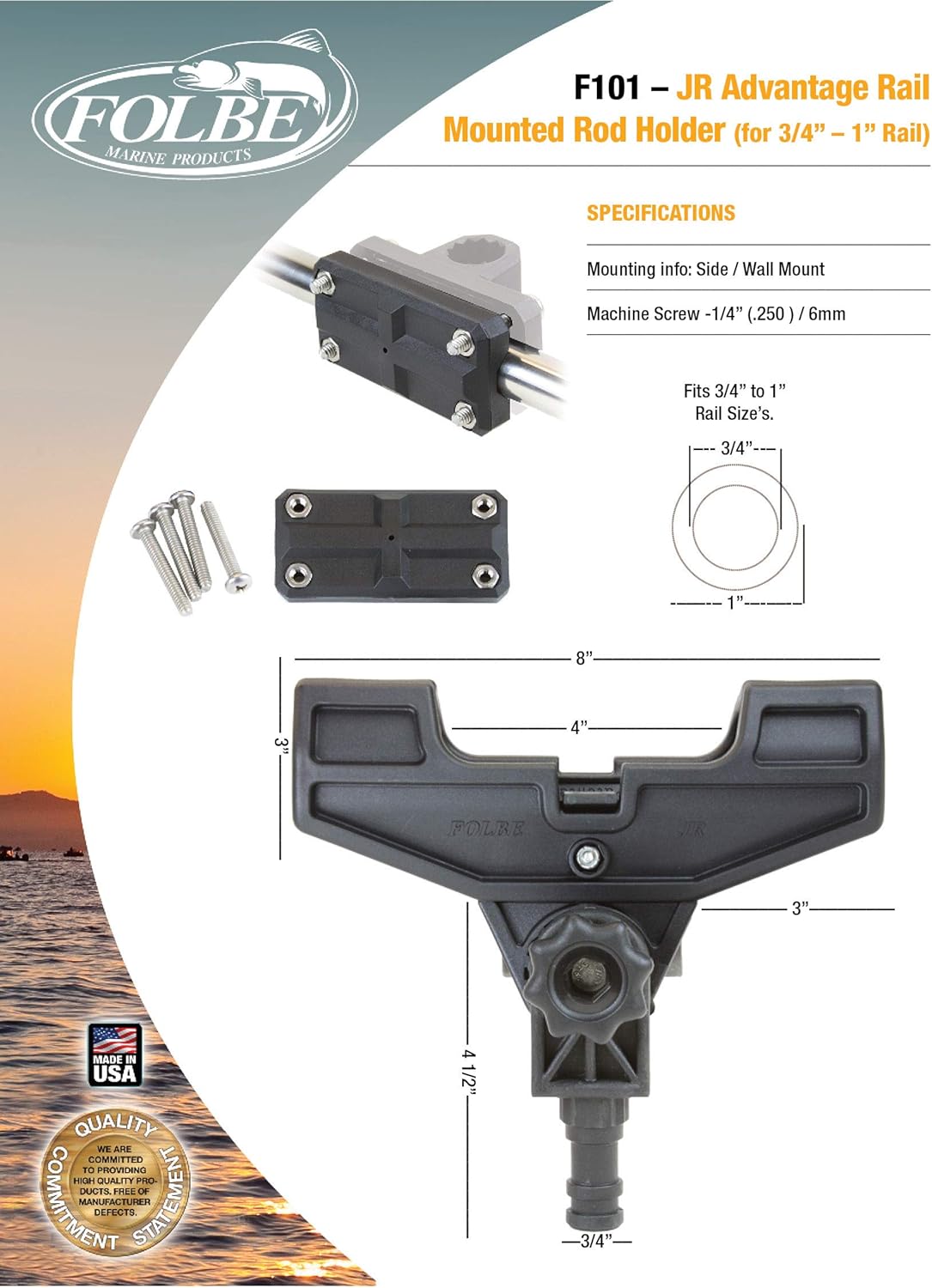 Folbe F101 - Advantage JR (Side Rail Adapter Mounted). A smaller, updated version of it's big brother – the clam shell design gives the angler all the benefits of our original Advantage Rod Holder, but in a compact size. The JR holds your rod securely, yet easily releases it when needed – pull your rod out and set the hook in one quick motion. Perfect for everything from kayaks to larger vessels, it fits all trout, pan-fish, walleye and most salmon rods. High quality materials ensure years of reliable use. Features Cut-outs for left or right hand spinning reels. Shorter top profile for line clearance of low profile reels. Shorter top profile holds rods tighter, less movement. Shorter top profile for holding two-handed fly reels. Fits spinning, casting, and trolling rods. Holds rod with up to 1.2” handles. 2/3 smaller than the original Advantage rod holder. Has cut-outs to accept rods with finger (trigger) grips. Virtually eliminates the struggle to get your rod out. Mounting bases are auto-locking and holds gear securely. Simple and easy to use. 100% Made in the USA.